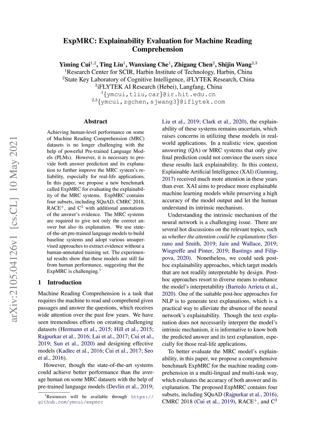 ExpMRC: Explainability Evaluation for Machine Reading Comprehension