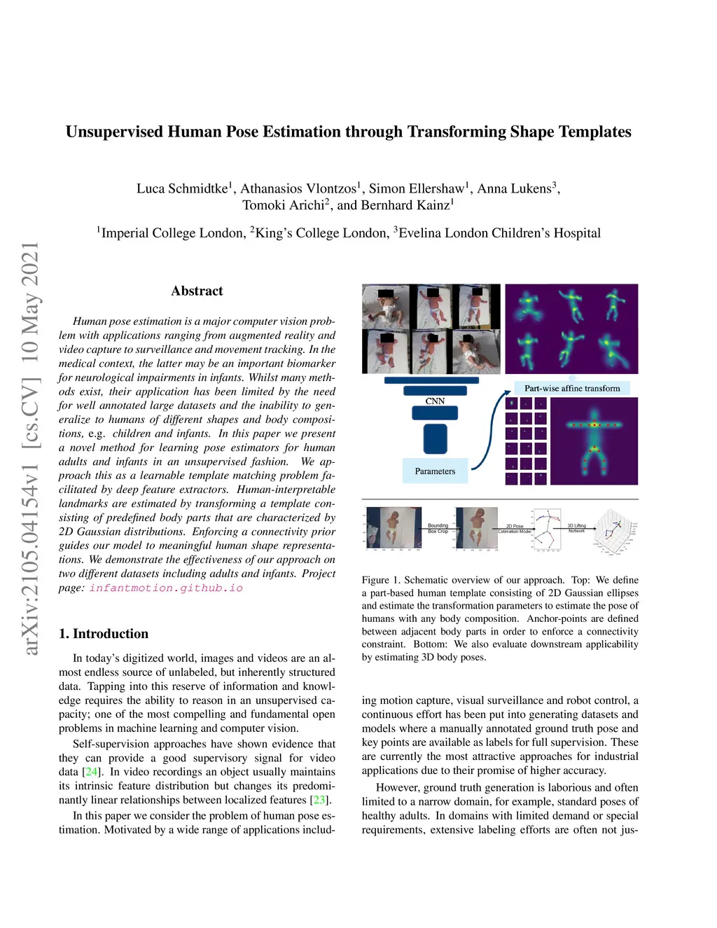 Human pose estimation is a major computer vision problem with applications ranging from augmented reality and video capture to surveillance and movement tracking. In the medical context, the latter may be an important biomarker for neurological impairments in infants. Whilst many methods exist, their application has been limited by the need for well annotated large datasets and the inability to generalize to humans of different shapes and body compositions, e.g. children and infants. In this paper we present a novel method for learning pose estimators for human adults and infants in an unsupervised fashion. We approach this as a learnable template matching problem facilitated by deep feature extractors. Human-interpretable landmarks are estimated by transforming a template consisting of predefined body parts that are characterized by 2D Gaussian distributions. Enforcing a connectivity prior guides our model to meaningful human shape representations. We demonstrate the effectiveness of our approach on two different datasets including adults and infants.