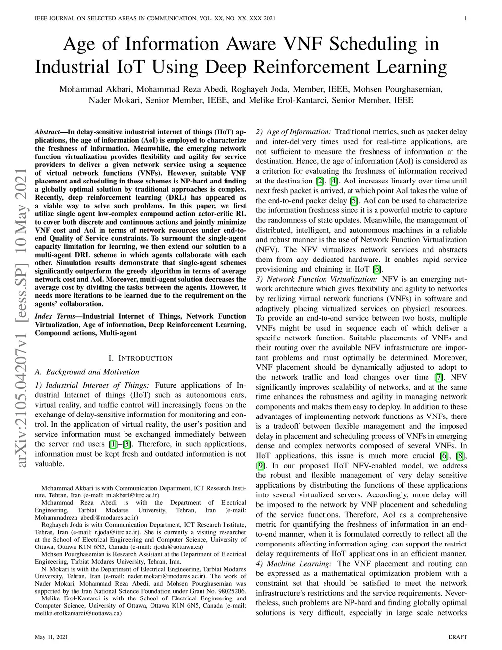 In delay-sensitive industrial internet of things (IIoT) applications, the age of information (AoI) is employed to characterize the freshness of information. Meanwhile, the emerging network function virtualization provides flexibility and agility for service providers to deliver a given network service using a sequence of virtual network functions (VNFs). However, suitable VNF placement and scheduling in these schemes is NP-hard and finding a globally optimal solution by traditional approaches is complex. Recently, deep reinforcement learning (DRL) has appeared as a viable way to solve such problems. In this paper, we first utilize single agent low-complex compound action actor-critic RL to cover both discrete and continuous actions and jointly minimize VNF cost and AoI in terms of network resources under end-to end Quality of Service constraints. To surmount the single-agent capacity limitation for learning, we then extend our solution to a multi-agent DRL scheme in which agents collaborate with each other. Simulation results demonstrate that single-agent schemes significantly outperform the greedy algorithm in terms of average network cost and AoI. Moreover, multi-agent solution decreases the average cost by dividing the tasks between the agents. However, it needs more iterations to be learned due to the requirement on the agents collaboration.