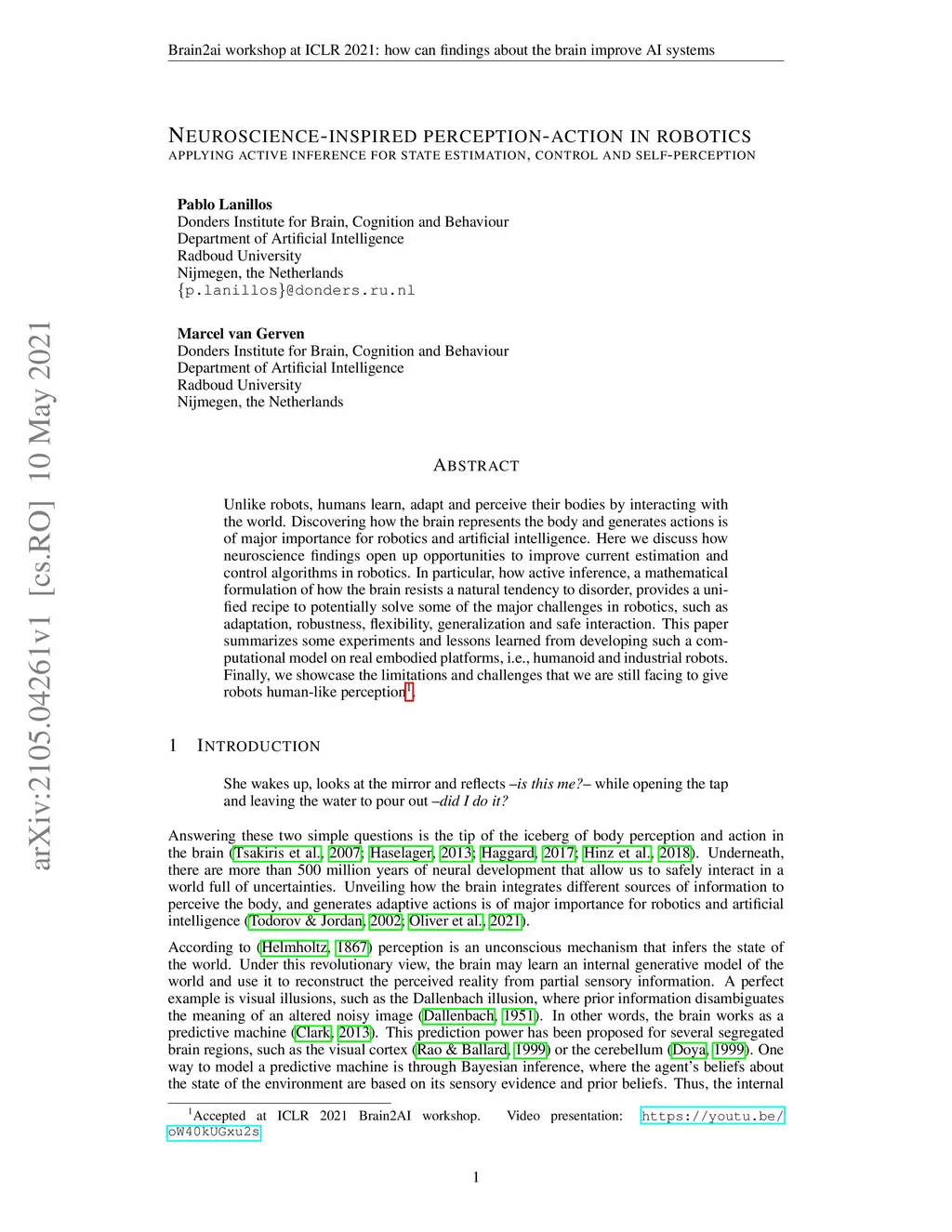 Unlike robots, humans learn, adapt and perceive their bodies by interacting with the world. Discovering how the brain represents the body and generates actions is of major importance for robotics and artificial intelligence. Here we discuss how neuroscience findings open up opportunities to improve current estimation and control algorithms in robotics. In particular, how active inference, a mathematical formulation of how the brain resists a natural tendency to disorder, provides a unified recipe to potentially solve some of the major challenges in robotics, such as adaptation, robustness, flexibility, generalization and safe interaction. This paper summarizes some experiments and lessons learned from developing such a computational model on real embodied platforms, i.e., humanoid and industrial robots. Finally, we showcase the limitations and challenges that we are still facing to give robots human-like perception