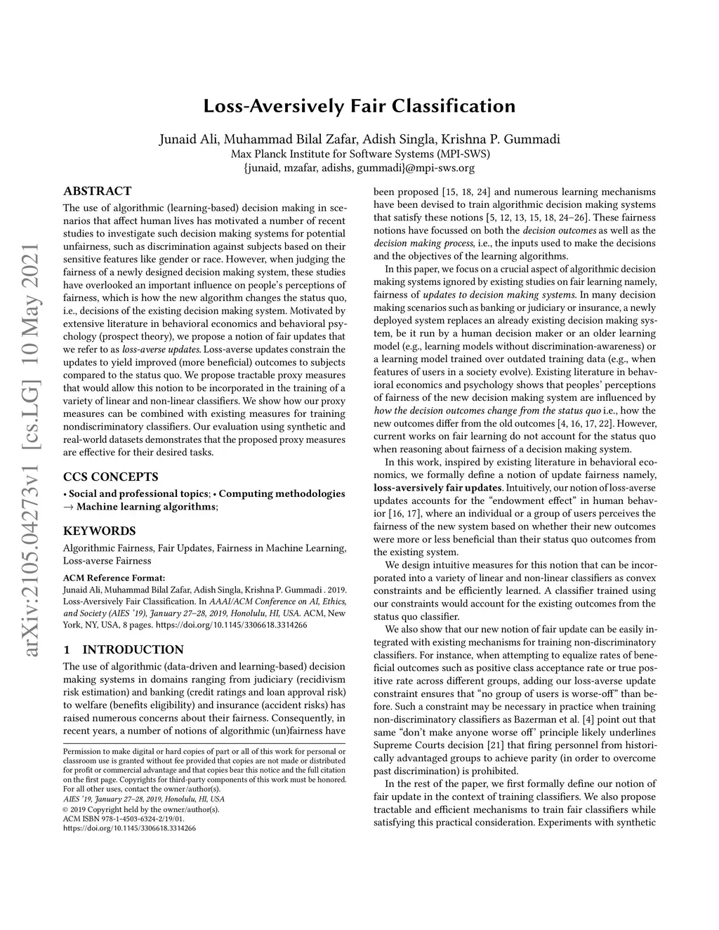 The use of algorithmic (learning-based) decision making in scenarios that affect human lives has motivated a number of recent studies to investigate such decision making systems for potential unfairness, such as discrimination against subjects based on their sensitive features like gender or race. However, when judging the fairness of a newly designed decision making system, these studies have overlooked an important influence on people's perceptions of fairness, which is how the new algorithm changes the status quo, i.e., decisions of the existing decision making system. Motivated by extensive literature in behavioral economics and behavioral psychology (prospect theory), we propose a notion of fair updates that we refer to as loss-averse updates. Loss-averse updates constrain the updates to yield improved (more beneficial) outcomes to subjects compared to the status quo. We propose tractable proxy measures that would allow this notion to be incorporated in the training of a variety of linear and non-linear classifiers. We show how our proxy measures can be combined with existing measures for training nondiscriminatory classifiers. Our evaluation using synthetic and real-world datasets demonstrates that the proposed proxy measures are effective for their desired tasks.