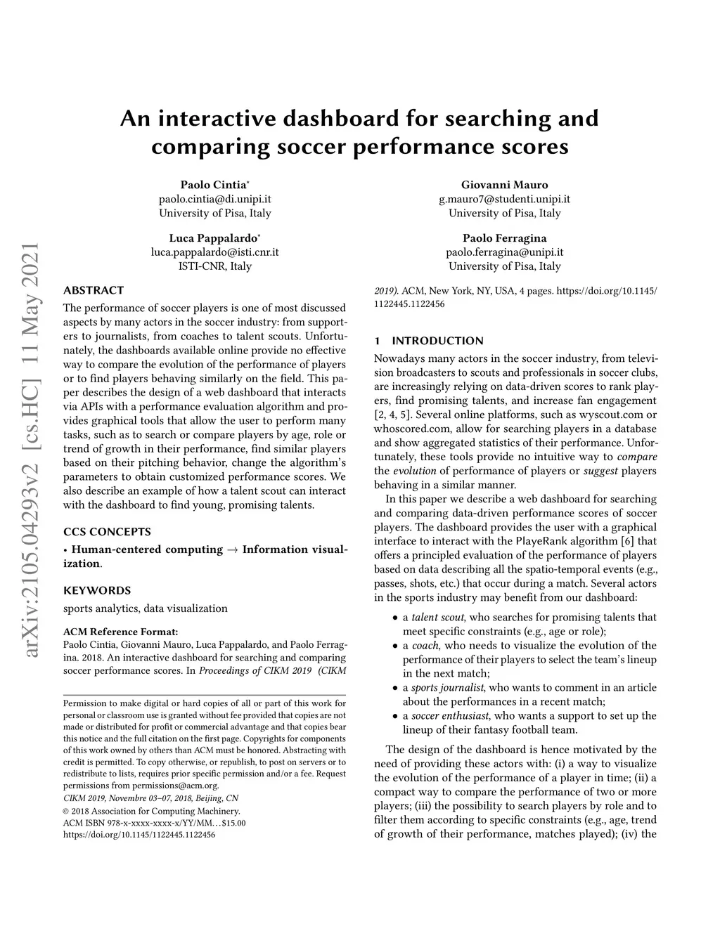 The performance of soccer players is one of most discussed aspects by many actors in the soccer industry: from supporters to journalists, from coaches to talent scouts. Unfortunately, the dashboards available online provide no effective way to compare the evolution of the performance of players or to find players behaving similarly on the field. This paper describes the design of a web dashboard that interacts via APIs with a performance evaluation algorithm and provides graphical tools that allow the user to perform many tasks, such as to search or compare players by age, role or trend of growth in their performance, find similar players based on their pitching behavior, change the algorithm's parameters to obtain customized performance scores. We also describe an example of how a talent scout can interact with the dashboard to find young, promising talents.