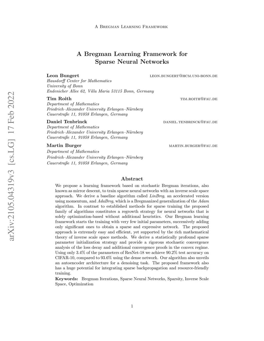 We propose a learning framework based on stochastic Bregman iterations, also known as mirror descent, to train sparse neural networks with an inverse scale space approach. We derive a baseline algorithm called LinBreg, an accelerated version using momentum, and AdaBreg, which is a Bregmanized generalization of the Adam algorithm. In contrast to established methods for sparse training the proposed family of algorithms constitutes a regrowth strategy for neural networks that is solely optimization-based without additional heuristics. Our Bregman learning framework starts the training with very few initial parameters, successively adding only significant ones to obtain a sparse and expressive network. The proposed approach is extremely easy and efficient, yet supported by the rich mathematical theory of inverse scale space methods. We derive a statistically profound sparse parameter initialization strategy and provide a rigorous stochastic convergence analysis of the loss decay and additional convergence proofs in the convex regime. Using only 3.4% of the parameters of ResNet-18 we achieve 90.2% test accuracy on CIFAR-10, compared to 93.6% using the dense network. Our algorithm also unveils an autoencoder architecture for a denoising task. The proposed framework also has a huge potential for integrating sparse backpropagation and resource-friendly training.