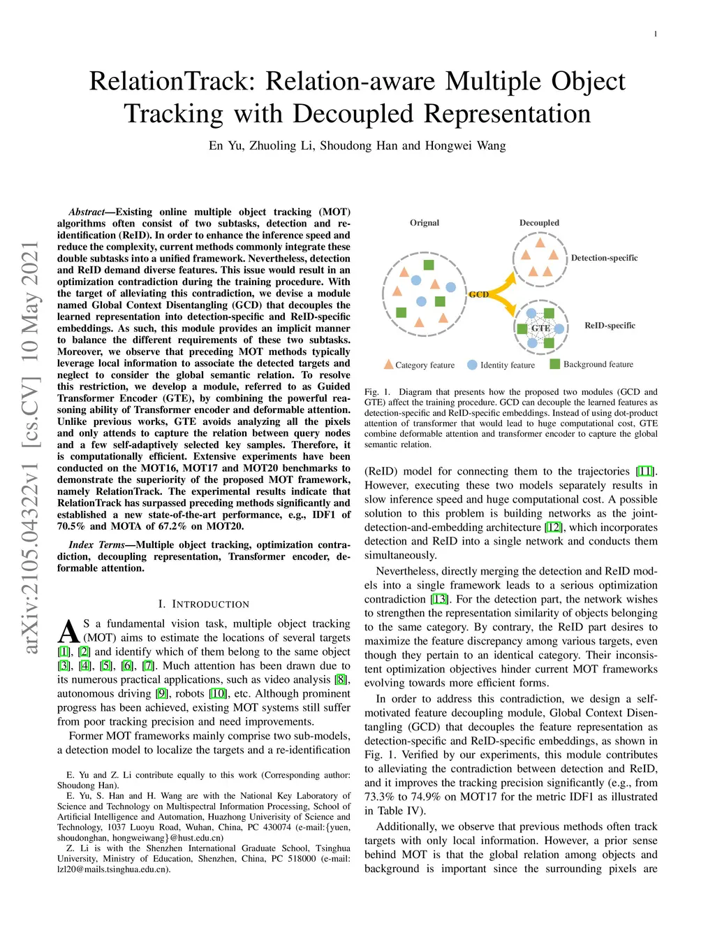 Existing online multiple object tracking (MOT) algorithms often consist of two subtasks, detection and re-identification (ReID). In order to enhance the inference speed and reduce the complexity, current methods commonly integrate these double subtasks into a unified framework. Nevertheless, detection and ReID demand diverse features. This issue would result in an optimization contradiction during the training procedure. With the target of alleviating this contradiction, we devise a module named Global Context Disentangling (GCD) that decouples the learned representation into detection-specific and ReID-specific embeddings. As such, this module provides an implicit manner to balance the different requirements of these two subtasks. Moreover, we observe that preceding MOT methods typically leverage local information to associate the detected targets and neglect to consider the global semantic relation. To resolve this restriction, we develop a module, referred to as Guided Transformer Encoder (GTE), by combining the powerful reasoning ability of Transformer encoder and deformable attention. Unlike previous works, GTE avoids analyzing all the pixels and only attends to capture the relation between query nodes and a few self-adaptively selected key samples. Therefore, it is computationally efficient. Extensive experiments have been conducted on the MOT16, MOT17 and MOT20 benchmarks to demonstrate the superiority of the proposed MOT framework, namely RelationTrack. The experimental results indicate that RelationTrack has surpassed preceding methods significantly and established a new state-of-the-art performance, e.g., IDF1 of 70.5% and MOTA of 67.2% on MOT20.
