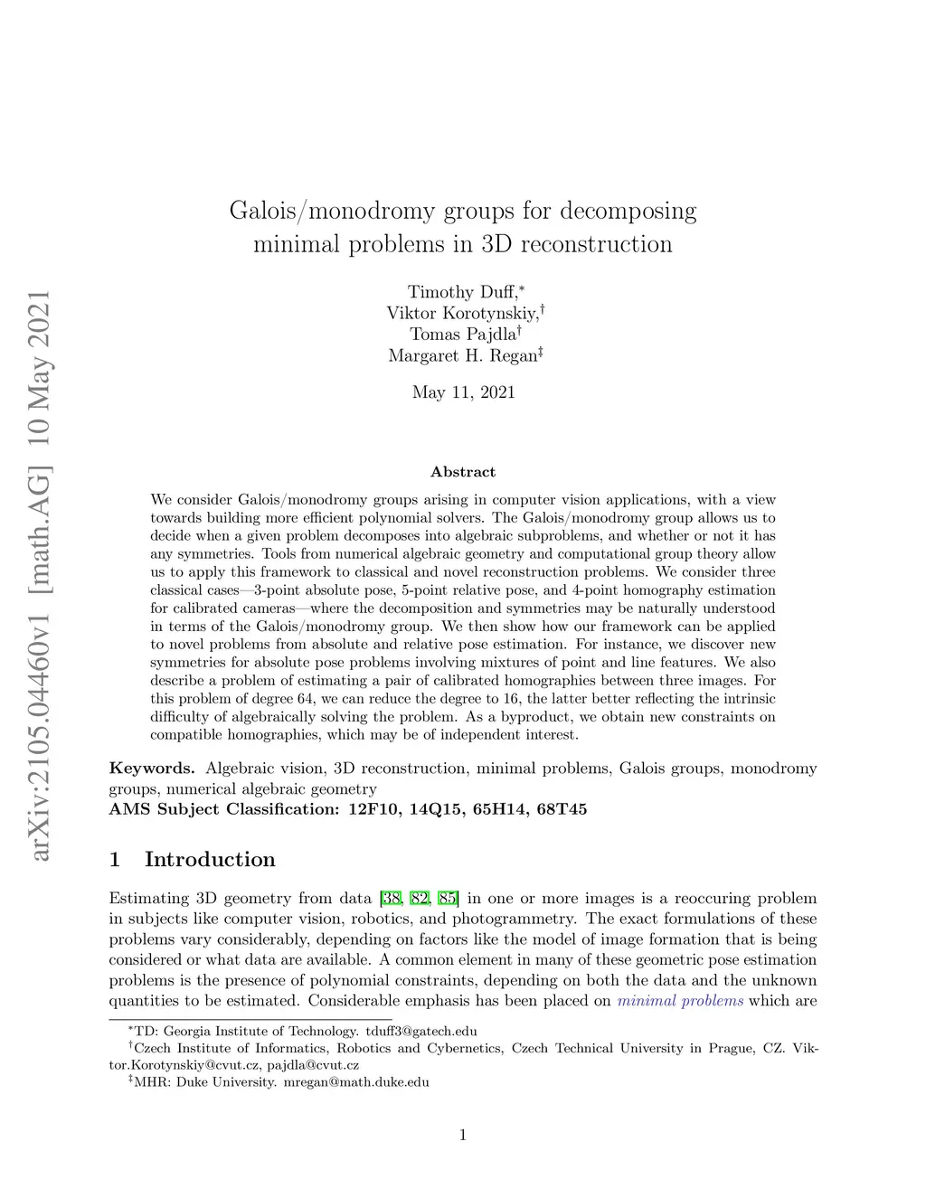 We consider Galois/monodromy groups arising in computer vision applications, with a view towards building more efficient polynomial solvers. The Galois/monodromy group allows us to decide when a given problem decomposes into algebraic subproblems, and whether or not it has any symmetries. Tools from numerical algebraic geometry and computational group theory allow us to apply this framework to classical and novel reconstruction problems. We consider three classical cases--3-point absolute pose, 5-point relative pose, and 4-point homography estimation for calibrated cameras--where the decomposition and symmetries may be naturally understood in terms of the Galois/monodromy group. We then show how our framework can be applied to novel problems from absolute and relative pose estimation. For instance, we discover new symmetries for absolute pose problems involving mixtures of point and line features. We also describe a problem of estimating a pair of calibrated homographies between three images. For this problem of degree 64, we can reduce the degree to 16; the latter better reflecting the intrinsic difficulty of algebraically solving the problem. As a byproduct, we obtain new constraints on compatible homographies, which may be of independent interest.