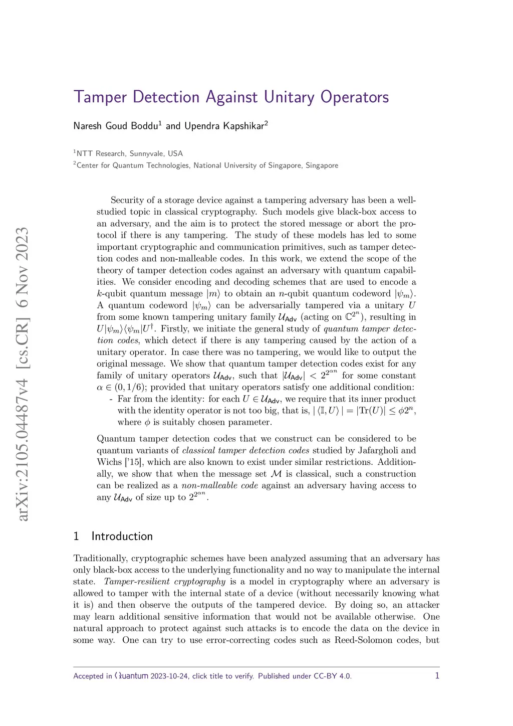 Security of a storage device against a tampering adversary has been a well-studied topic in classical cryptography. Such models give black-box access to an adversary, and the aim is to protect the stored message or abort the protocol if there is any tampering. In this work, we extend the scope of the theory of tamper detection codes against an adversary with quantum capabilities. We consider encoding and decoding schemes that are used to encode a -qubit quantum message to obtain an -qubit quantum codeword . A quantum codeword can be adversarially tampered via a unitary from some known tampering unitary family (acting on ). Firstly, we initiate the general study of \emph{quantum tamper detection codes}, which detect if there is any tampering caused by the action of a unitary operator. In case there was no tampering, we would like to output the original message. We show that quantum tamper detection codes exist for any family of unitary operators , such that for some constant ; provided that unitary operators are not too close to the identity operator. Quantum tamper detection codes that we construct can be considered to be quantum variants of \emph{classical tamper detection codes} studied by Jafargholi and Wichs~['15], which are also known to exist under similar restrictions. Additionally, we show that when the message set is classical, such a construction can be realized as a \emph{non-malleable code} against any of size up to .