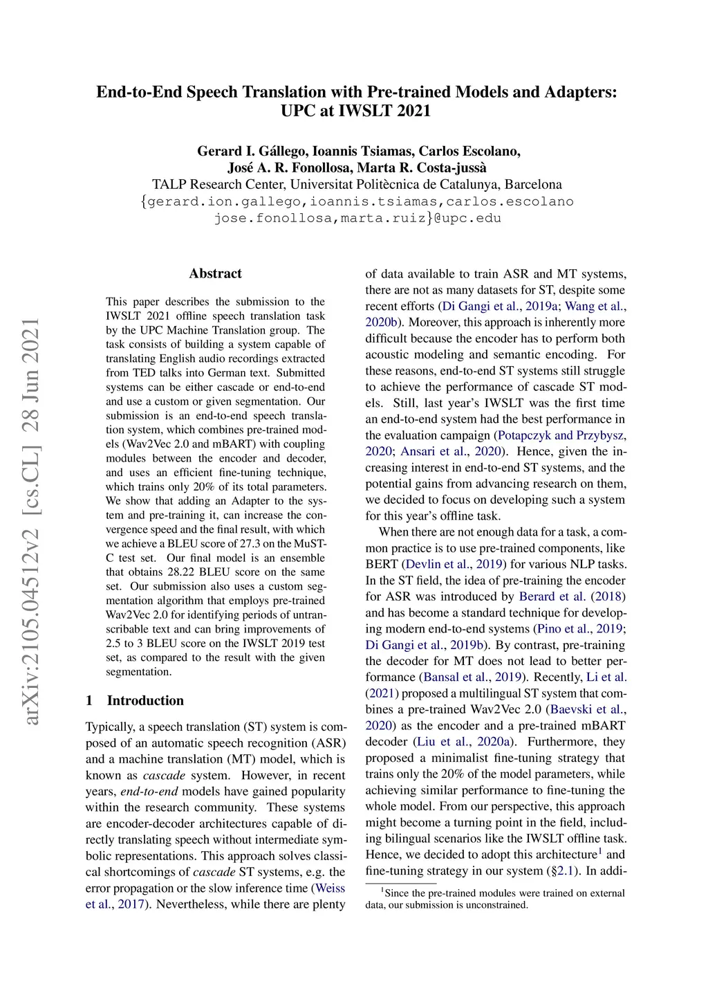 This paper describes the submission to the IWSLT 2021 offline speech translation task by the UPC Machine Translation group. The task consists of building a system capable of translating English audio recordings extracted from TED talks into German text. Submitted systems can be either cascade or end-to-end and use a custom or given segmentation. Our submission is an end-to-end speech translation system, which combines pre-trained models (Wav2Vec 2.0 and mBART) with coupling modules between the encoder and decoder, and uses an efficient fine-tuning technique, which trains only 20% of its total parameters. We show that adding an Adapter to the system and pre-training it, can increase the convergence speed and the final result, with which we achieve a BLEU score of 27.3 on the MuST-C test set. Our final model is an ensemble that obtains 28.22 BLEU score on the same set. Our submission also uses a custom segmentation algorithm that employs pre-trained Wav2Vec 2.0 for identifying periods of untranscribable text and can bring improvements of 2.5 to 3 BLEU score on the IWSLT 2019 test set, as compared to the result with the given segmentation.