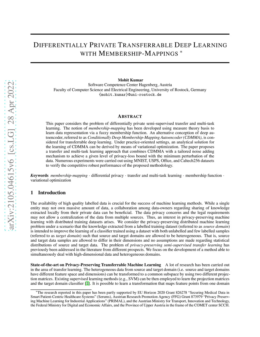 This paper considers the problem of differentially private semi-supervised transfer and multi-task learning. The notion of \emph{membership-mapping} has been developed using measure theory basis to learn data representation via a fuzzy membership function. An alternative conception of deep autoencoder, referred to as \emph{Conditionally Deep Membership-Mapping Autoencoder (CDMMA)}, is considered for transferrable deep learning. Under practice-oriented settings, an analytical solution for the learning of CDMMA can be derived by means of variational optimization. The paper proposes a transfer and multi-task learning approach that combines CDMMA with a tailored noise adding mechanism to achieve a given level of privacy-loss bound with the minimum perturbation of the data. Numerous experiments were carried out using MNIST, USPS, Office, and Caltech256 datasets to verify the competitive robust performance of the proposed methodology.