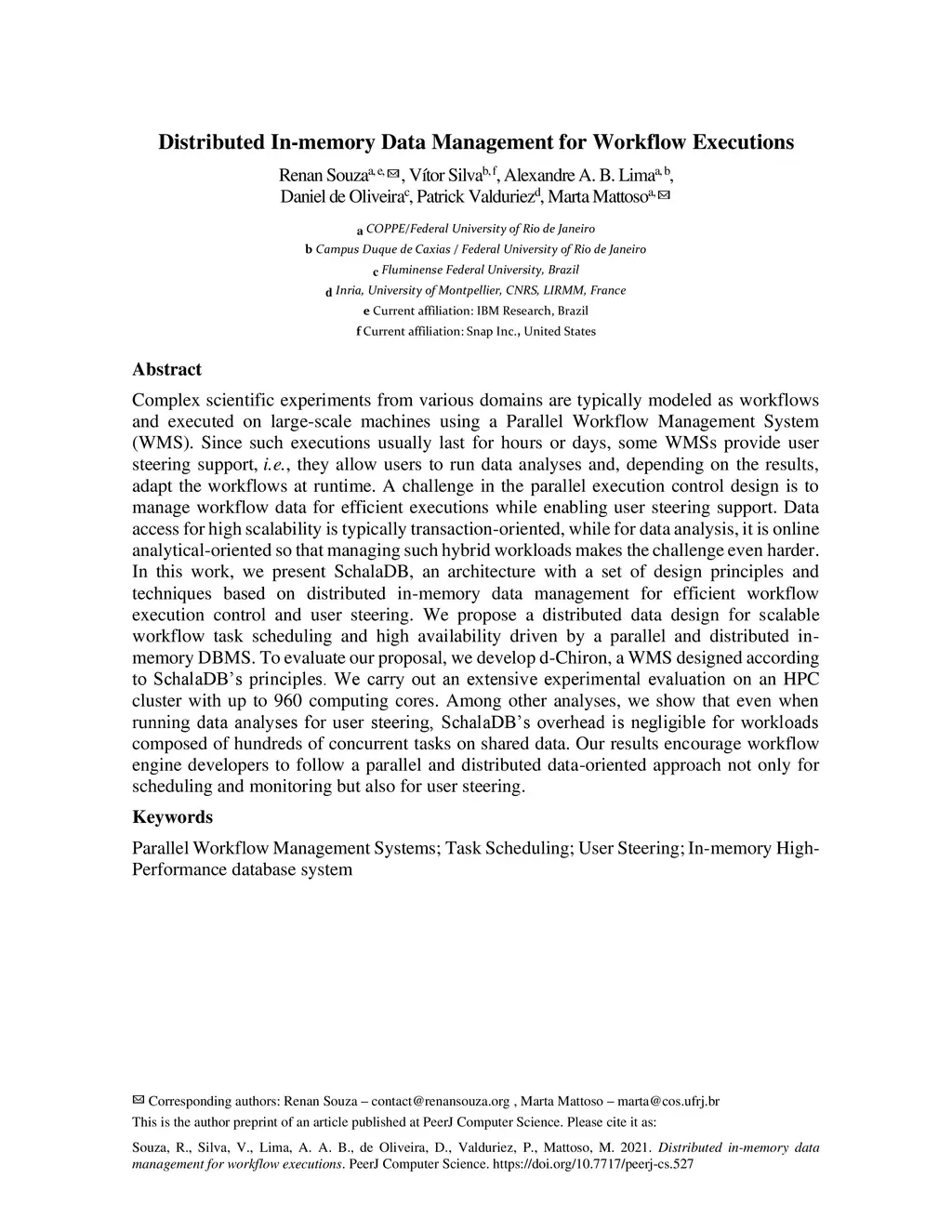 Complex scientific experiments from various domains are typically modeled as workflows and executed on large-scale machines using a Parallel Workflow Management System (WMS). Since such executions usually last for hours or days, some WMSs provide user steering support, i.e., they allow users to run data analyses and, depending on the results, adapt the workflows at runtime. A challenge in the parallel execution control design is to manage workflow data for efficient executions while enabling user steering support. Data access for high scalability is typically transaction-oriented, while for data analysis, it is online analytical-oriented so that managing such hybrid workloads makes the challenge even harder. In this work, we present SchalaDB, an architecture with a set of design principles and techniques based on distributed in-memory data management for efficient workflow execution control and user steering. We propose a distributed data design for scalable workflow task scheduling and high availability driven by a parallel and distributed in-memory DBMS. To evaluate our proposal, we develop d-Chiron, a WMS designed according to SchalaDB's principles. We carry out an extensive experimental evaluation on an HPC cluster with up to 960 computing cores. Among other analyses, we show that even when running data analyses for user steering, SchalaDB's overhead is negligible for workloads composed of hundreds of concurrent tasks on shared data. Our results encourage workflow engine developers to follow a parallel and distributed data-oriented approach not only for scheduling and monitoring but also for user steering.