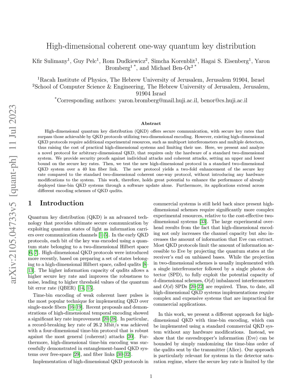 High-dimensional quantum key distribution (QKD) offers secure communication, with secure key rates that surpass those achievable by QKD protocols utilizing two-dimensional encoding. However, existing high-dimensional QKD protocols require additional experimental resources, such as multiport interferometers and multiple detectors, thus raising the cost of practical high-dimensional systems and limiting their use. Here, we present and analyze a novel protocol for arbitrary-dimensional QKD, that requires only the hardware of a standard two-dimensional system. We provide security proofs against individual attacks and coherent attacks, setting an upper and lower bound on the secure key rates. Then, we test the new high-dimensional protocol in a standard two-dimensional QKD system over a 40 km fiber link. The new protocol yields a two-fold enhancement of the secure key rate compared to the standard two-dimensional coherent one-way protocol, without introducing any hardware modifications to the system. This work, therefore, holds great potential to enhance the performance of already deployed time-bin QKD systems through a software update alone. Furthermore, its applications extend across different encoding schemes of QKD qudits.