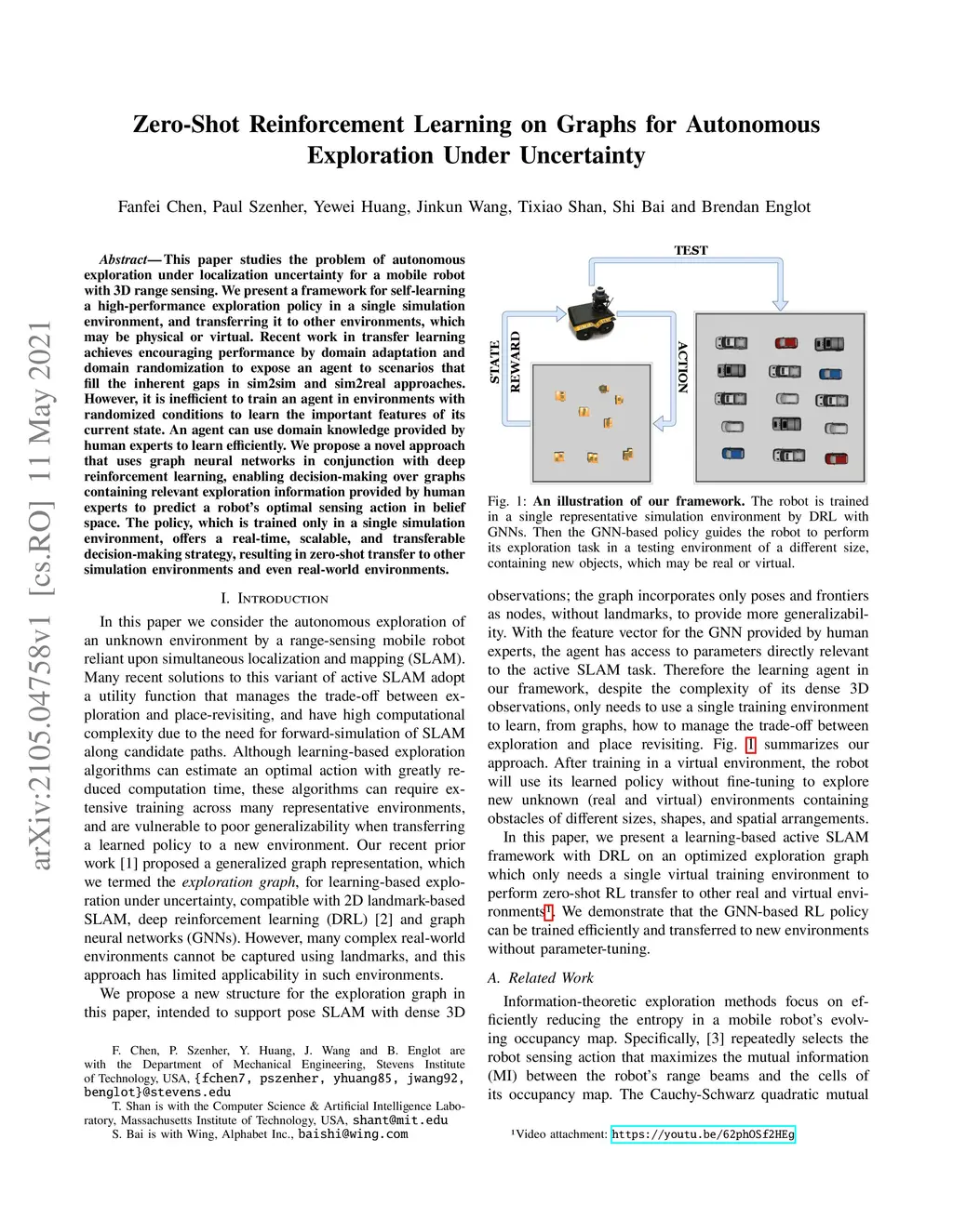 This paper studies the problem of autonomous exploration under localization uncertainty for a mobile robot with 3D range sensing. We present a framework for self-learning a high-performance exploration policy in a single simulation environment, and transferring it to other environments, which may be physical or virtual. Recent work in transfer learning achieves encouraging performance by domain adaptation and domain randomization to expose an agent to scenarios that fill the inherent gaps in sim2sim and sim2real approaches. However, it is inefficient to train an agent in environments with randomized conditions to learn the important features of its current state. An agent can use domain knowledge provided by human experts to learn efficiently. We propose a novel approach that uses graph neural networks in conjunction with deep reinforcement learning, enabling decision-making over graphs containing relevant exploration information provided by human experts to predict a robot's optimal sensing action in belief space. The policy, which is trained only in a single simulation environment, offers a real-time, scalable, and transferable decision-making strategy, resulting in zero-shot transfer to other simulation environments and even real-world environments.