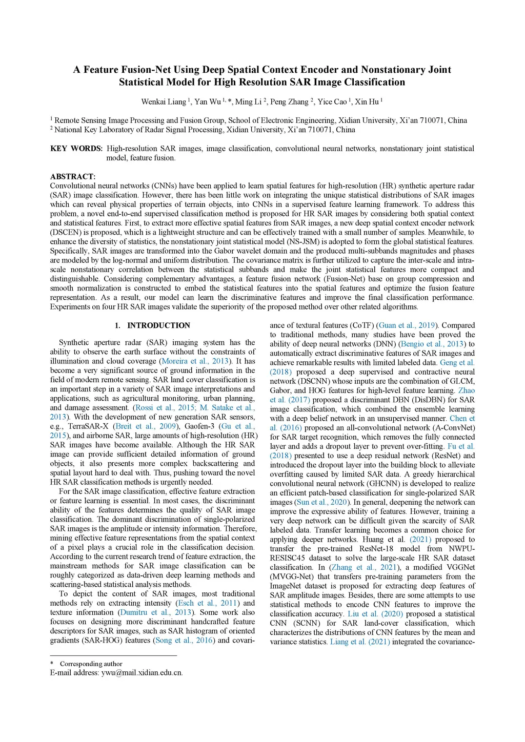Convolutional neural networks (CNNs) have been applied to learn spatial features for high-resolution (HR) synthetic aperture radar (SAR) image classification. However, there has been little work on integrating the unique statistical distributions of SAR images which can reveal physical properties of terrain objects, into CNNs in a supervised feature learning framework. To address this problem, a novel end-to-end supervised classification method is proposed for HR SAR images by considering both spatial context and statistical features. First, to extract more effective spatial features from SAR images, a new deep spatial context encoder network (DSCEN) is proposed, which is a lightweight structure and can be effectively trained with a small number of samples. Meanwhile, to enhance the diversity of statistics, the nonstationary joint statistical model (NS-JSM) is adopted to form the global statistical features. Specifically, SAR images are transformed into the Gabor wavelet domain and the produced multi-subbands magnitudes and phases are modeled by the log-normal and uniform distribution. The covariance matrix is further utilized to capture the inter-scale and intra-scale nonstationary correlation between the statistical subbands and make the joint statistical features more compact and distinguishable. Considering complementary advantages, a feature fusion network (Fusion-Net) base on group compression and smooth normalization is constructed to embed the statistical features into the spatial features and optimize the fusion feature representation. As a result, our model can learn the discriminative features and improve the final classification performance. Experiments on four HR SAR images validate the superiority of the proposed method over other related algorithms.