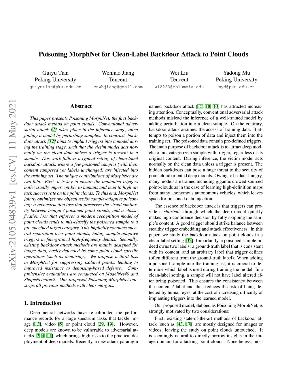 This paper presents Poisoning MorphNet, the first backdoor attack method on point clouds. Conventional adversarial attack takes place in the inference stage, often fooling a model by perturbing samples. In contrast, backdoor attack aims to implant triggers into a model during the training stage, such that the victim model acts normally on the clean data unless a trigger is present in a sample. This work follows a typical setting of clean-label backdoor attack, where a few poisoned samples (with their content tampered yet labels unchanged) are injected into the training set. The unique contributions of MorphNet are two-fold. First, it is key to ensure the implanted triggers both visually imperceptible to humans and lead to high attack success rate on the point clouds. To this end, MorphNet jointly optimizes two objectives for sample-adaptive poisoning: a reconstruction loss that preserves the visual similarity between benign / poisoned point clouds, and a classification loss that enforces a modern recognition model of point clouds tends to mis-classify the poisoned sample to a pre-specified target category. This implicitly conducts spectral separation over point clouds, hiding sample-adaptive triggers in fine-grained high-frequency details. Secondly, existing backdoor attack methods are mainly designed for image data, easily defended by some point cloud specific operations (such as denoising). We propose a third loss in MorphNet for suppressing isolated points, leading to improved resistance to denoising-based defense. Comprehensive evaluations are conducted on ModelNet40 and ShapeNetcorev2. Our proposed Poisoning MorphNet outstrips all previous methods with clear margins.