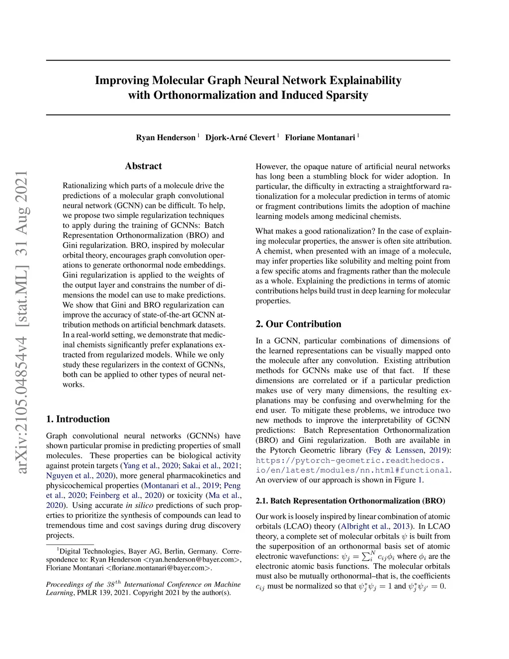 Rationalizing which parts of a molecule drive the predictions of a molecular graph convolutional neural network (GCNN) can be difficult. To help, we propose two simple regularization techniques to apply during the training of GCNNs: Batch Representation Orthonormalization (BRO) and Gini regularization. BRO, inspired by molecular orbital theory, encourages graph convolution operations to generate orthonormal node embeddings. Gini regularization is applied to the weights of the output layer and constrains the number of dimensions the model can use to make predictions. We show that Gini and BRO regularization can improve the accuracy of state-of-the-art GCNN attribution methods on artificial benchmark datasets. In a real-world setting, we demonstrate that medicinal chemists significantly prefer explanations extracted from regularized models. While we only study these regularizers in the context of GCNNs, both can be applied to other types of neural networks