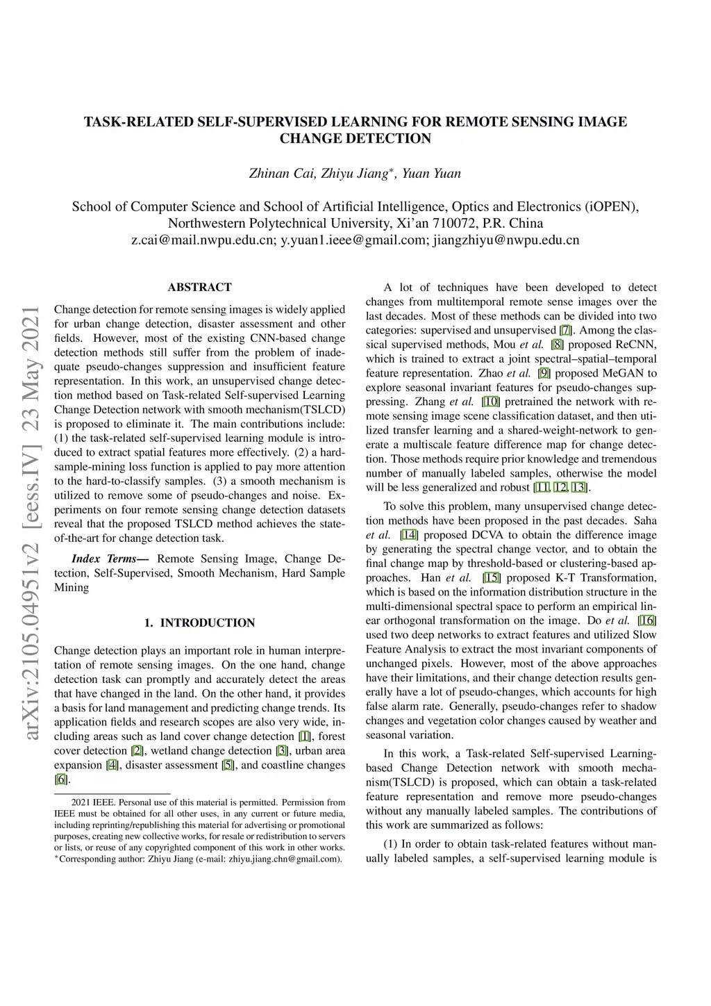 Change detection for remote sensing images is widely applied for urban change detection, disaster assessment and other fields. However, most of the existing CNN-based change detection methods still suffer from the problem of inadequate pseudo-changes suppression and insufficient feature representation. In this work, an unsupervised change detection method based on Task-related Self-supervised Learning Change Detection network with smooth mechanism(TSLCD) is proposed to eliminate it. The main contributions include: (1) the task-related self-supervised learning module is introduced to extract spatial features more effectively. (2) a hard-sample-mining loss function is applied to pay more attention to the hard-to-classify samples. (3) a smooth mechanism is utilized to remove some of pseudo-changes and noise. Experiments on four remote sensing change detection datasets reveal that the proposed TSLCD method achieves the state-of-the-art for change detection task.