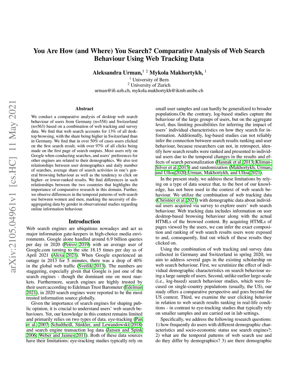 We conduct a comparative analysis of desktop web search behaviour of users from Germany (n=558) and Switzerland (n=563) based on a combination of web tracking and survey data. We find that web search accounts for 13% of all desktop browsing, with the share being higher in Switzerland than in Germany. We find that in over 50% of cases users clicked on the first search result, with over 97% of all clicks being made on the first page of search outputs. Most users rely on Google when conducting searches, and users preferences for other engines are related to their demographics. We also test relationships between user demographics and daily number of searches, average share of search activities among tracked events by user as well as the tendency to click on higher- or lower-ranked results. We find differences in such relationships between the two countries that highlights the importance of comparative research in this domain. Further, we observe differences in the temporal patterns of web search use between women and men, marking the necessity of disaggregating data by gender in observational studies regarding online information behaviour.