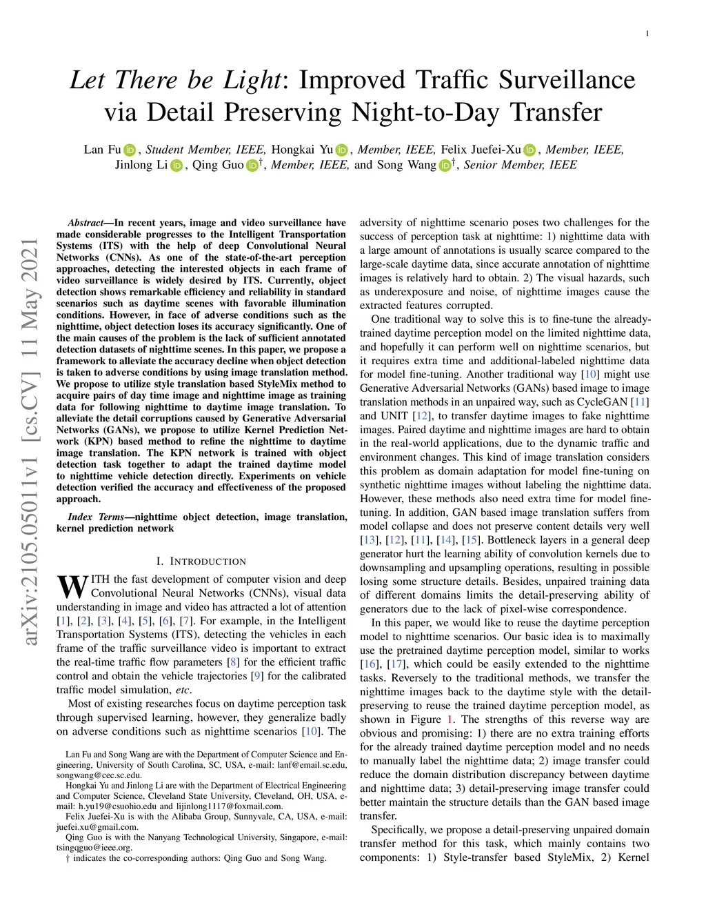 In recent years, image and video surveillance have made considerable progresses to the Intelligent Transportation Systems (ITS) with the help of deep Convolutional Neural Networks (CNNs). As one of the state-of-the-art perception approaches, detecting the interested objects in each frame of video surveillance is widely desired by ITS. Currently, object detection shows remarkable efficiency and reliability in standard scenarios such as daytime scenes with favorable illumination conditions. However, in face of adverse conditions such as the nighttime, object detection loses its accuracy significantly. One of the main causes of the problem is the lack of sufficient annotated detection datasets of nighttime scenes. In this paper, we propose a framework to alleviate the accuracy decline when object detection is taken to adverse conditions by using image translation method. We propose to utilize style translation based StyleMix method to acquire pairs of day time image and nighttime image as training data for following nighttime to daytime image translation. To alleviate the detail corruptions caused by Generative Adversarial Networks (GANs), we propose to utilize Kernel Prediction Network (KPN) based method to refine the nighttime to daytime image translation. The KPN network is trained with object detection task together to adapt the trained daytime model to nighttime vehicle detection directly. Experiments on vehicle detection verified the accuracy and effectiveness of the proposed approach.