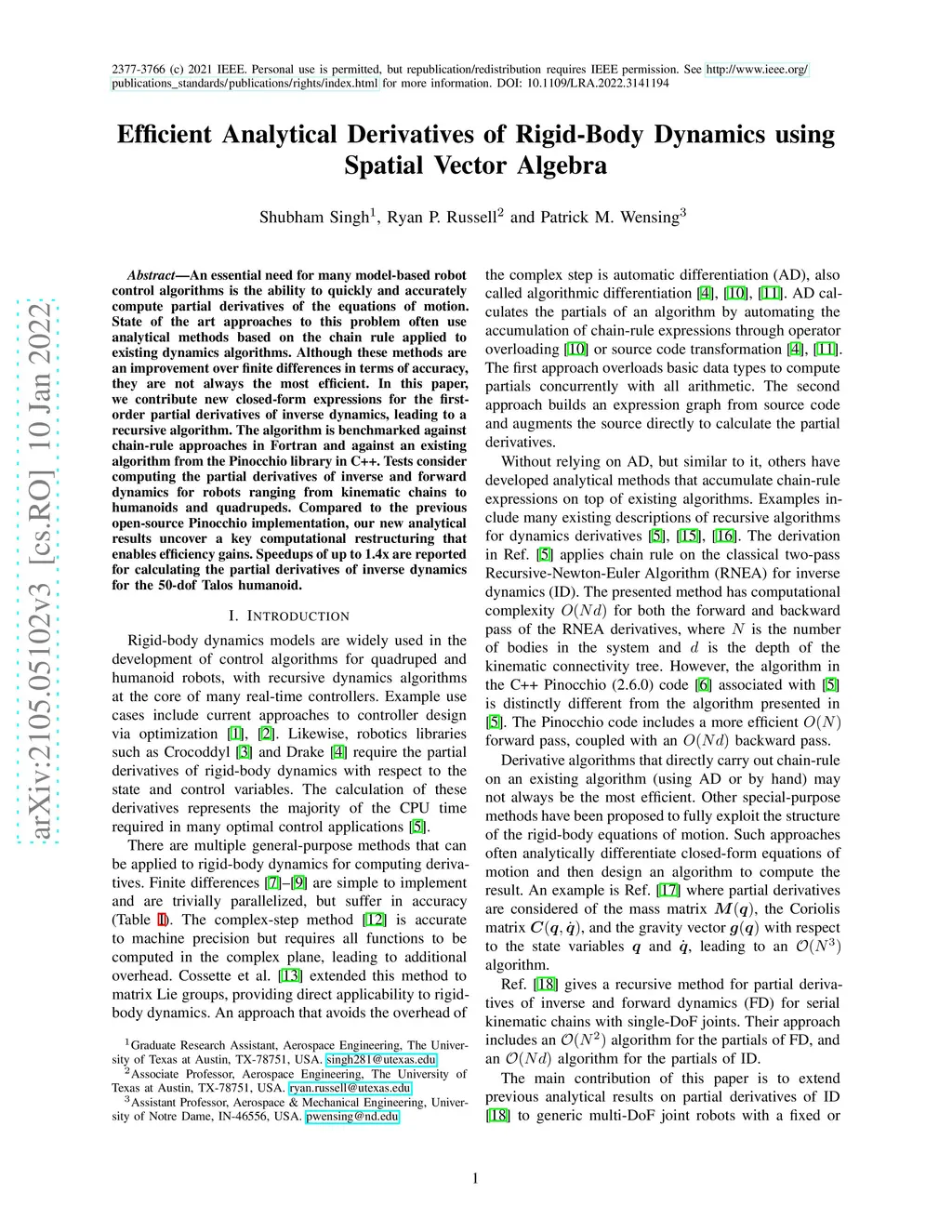 Efficient Analytical Derivatives of Rigid-Body Dynamics using Spatial