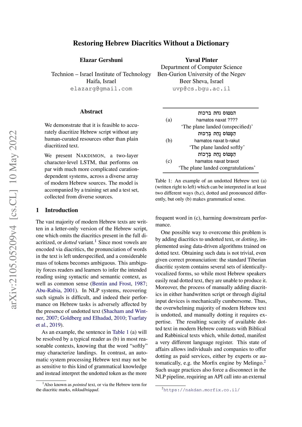 Restoring Hebrew Diacritics Without a Dictionary