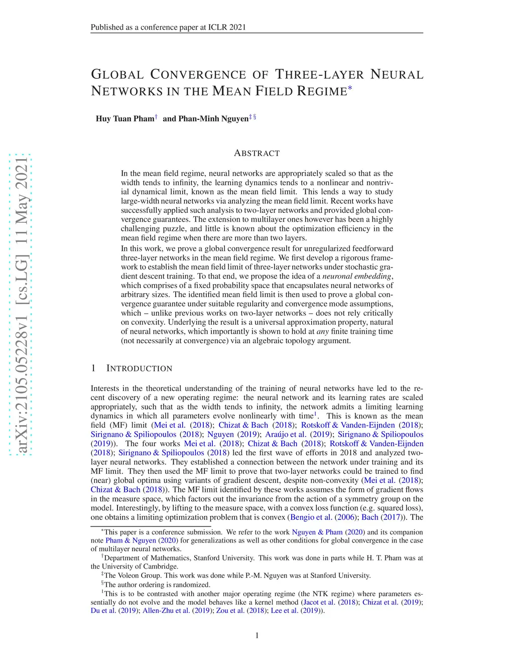 In the mean field regime, neural networks are appropriately scaled so that as the width tends to infinity, the learning dynamics tends to a nonlinear and nontrivial dynamical limit, known as the mean field limit. This lends a way to study large-width neural networks via analyzing the mean field limit. Recent works have successfully applied such analysis to two-layer networks and provided global convergence guarantees. The extension to multilayer ones however has been a highly challenging puzzle, and little is known about the optimization efficiency in the mean field regime when there are more than two layers. In this work, we prove a global convergence result for unregularized feedforward three-layer networks in the mean field regime. We first develop a rigorous framework to establish the mean field limit of three-layer networks under stochastic gradient descent training. To that end, we propose the idea of a \textit{neuronal embedding}, which comprises of a fixed probability space that encapsulates neural networks of arbitrary sizes. The identified mean field limit is then used to prove a global convergence guarantee under suitable regularity and convergence mode assumptions, which -- unlike previous works on two-layer networks -- does not rely critically on convexity. Underlying the result is a universal approximation property, natural of neural networks, which importantly is shown to hold at \textit{any} finite training time (not necessarily at convergence) via an algebraic topology argument.