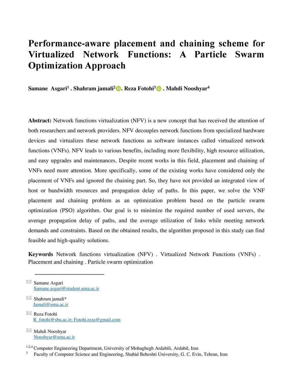Network functions virtualization (NFV) is a new concept that has received the attention of both researchers and network providers. NFV decouples network functions from specialized hardware devices and virtualizes these network functions as software instances called virtualized network functions (VNFs). NFV leads to various benefits, including more flexibility, high resource utilization, and easy upgrades and maintenances. Despite recent works in this field, placement and chaining of VNFs need more attention. More specifically, some of the existing works have considered only the placement of VNFs and ignored the chaining part. So, they have not provided an integrated view of host or bandwidth resources and propagation delay of paths. In this paper, we solve the VNF placement and chaining problem as an optimization problem based on the particle swarm optimization (PSO) algorithm. Our goal is to minimize the required number of used servers, the average propagation delay of paths, and the average utilization of links while meeting network demands and constraints. Based on the obtained results, the algorithm proposed in this study can find feasible and high-quality solutions.