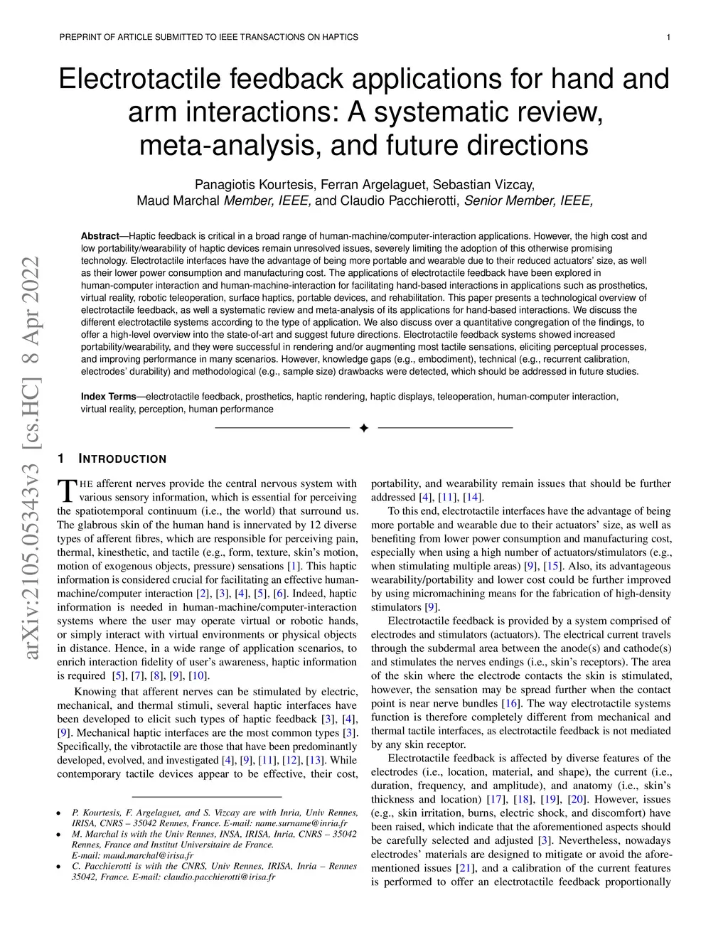 Haptic feedback is critical in a broad range of human-machine/computer-interaction applications. However, the high cost and low portability/wearability of haptic devices remain unresolved issues, severely limiting the adoption of this otherwise promising technology. Electrotactile interfaces have the advantage of being more portable and wearable due to their reduced actuators' size, as well as their lower power consumption and manufacturing cost. The applications of electrotactile feedback have been explored in human-computer interaction and human-machine-interaction for facilitating hand-based interactions in applications such as prosthetics, virtual reality, robotic teleoperation, surface haptics, portable devices, and rehabilitation. This paper presents a technological overview of electrotactile feedback, as well a systematic review and meta-analysis of its applications for hand-based interactions. We discuss the different electrotactile systems according to the type of application. We also discuss over a quantitative congregation of the findings, to offer a high-level overview into the state-of-art and suggest future directions. Electrotactile feedback systems showed increased portability/wearability, and they were successful in rendering and/or augmenting most tactile sensations, eliciting perceptual processes, and improving performance in many scenarios. However, knowledge gaps (e.g., embodiment), technical (e.g., recurrent calibration, electrodes' durability) and methodological (e.g., sample size) drawbacks were detected, which should be addressed in future studies.