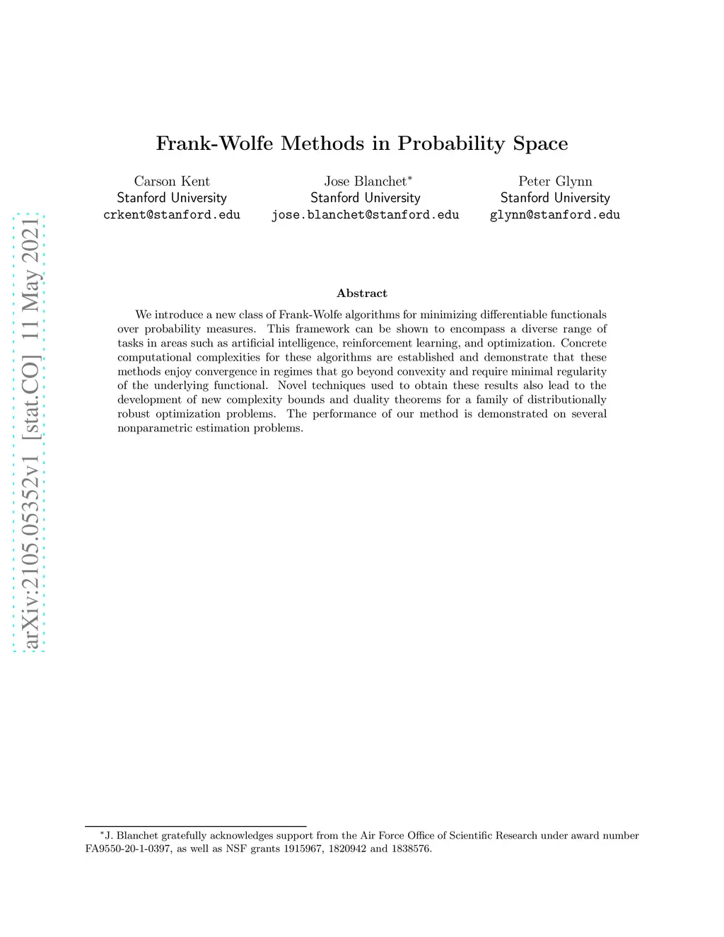 We introduce a new class of Frank-Wolfe algorithms for minimizing differentiable functionals over probability measures. This framework can be shown to encompass a diverse range of tasks in areas such as artificial intelligence, reinforcement learning, and optimization. Concrete computational complexities for these algorithms are established and demonstrate that these methods enjoy convergence in regimes that go beyond convexity and require minimal regularity of the underlying functional. Novel techniques used to obtain these results also lead to the development of new complexity bounds and duality theorems for a family of distributionally robust optimization problems. The performance of our method is demonstrated on several nonparametric estimation problems.