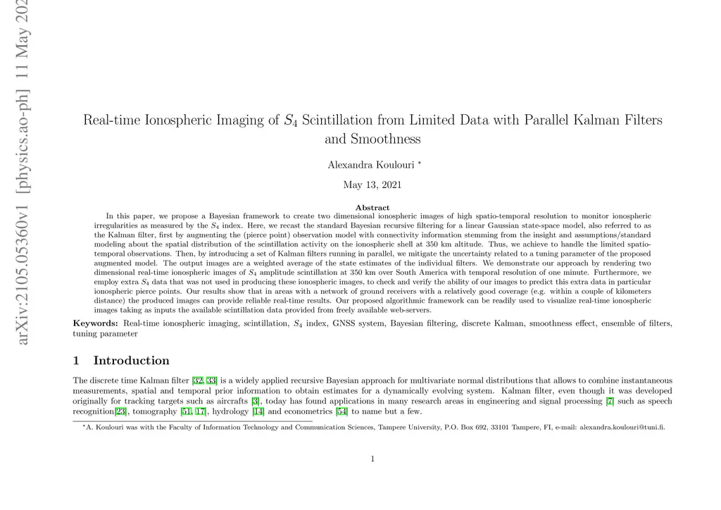 In this paper, we propose a Bayesian framework to create two dimensional ionospheric images of high spatio-temporal resolution to monitor ionospheric irregularities as measured by the S4 index. Here, we recast the standard Bayesian recursive filtering for a linear Gaussian state-space model, also referred to as the Kalman filter, first by augmenting the (pierce point) observation model with connectivity information stemming from the insight and assumptions/standard modeling about the spatial distribution of the scintillation activity on the ionospheric shell at 350 km altitude. Thus, we achieve to handle the limited spatio-temporal observations. Then, by introducing a set of Kalman filters running in parallel, we mitigate the uncertainty related to a tuning parameter of the proposed augmented model. The output images are a weighted average of the state estimates of the individual filters. We demonstrate our approach by rendering two dimensional real-time ionospheric images of S4 amplitude scintillation at 350 km over South America with temporal resolution of one minute. Furthermore, we employ extra S4 data that was not used in producing these ionospheric images, to check and verify the ability of our images to predict this extra data in particular ionospheric pierce points. Our results show that in areas with a network of ground receivers with a relatively good coverage (e.g. within a couple of kilometers distance) the produced images can provide reliable real-time results. Our proposed algorithmic framework can be readily used to visualize real-time ionospheric images taking as inputs the available scintillation data provided from freely available web-servers.