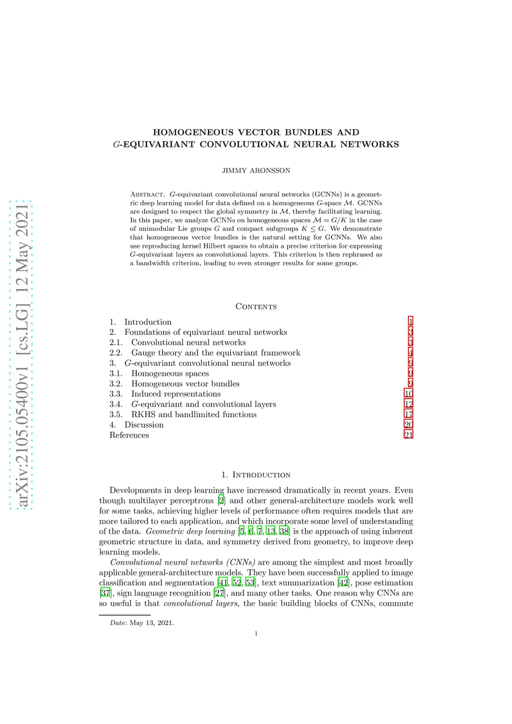 -equivariant convolutional neural networks (GCNNs) is a geometric deep learning model for data defined on a homogeneous -space . GCNNs are designed to respect the global symmetry in , thereby facilitating learning. In this paper, we analyze GCNNs on homogeneous spaces in the case of unimodular Lie groups and compact subgroups . We demonstrate that homogeneous vector bundles is the natural setting for GCNNs. We also use reproducing kernel Hilbert spaces to obtain a precise criterion for expressing -equivariant layers as convolutional layers. This criterion is then rephrased as a bandwidth criterion, leading to even stronger results for some groups.