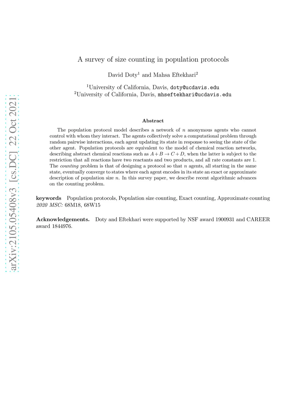 The population protocol model describes a network of anonymous agents who cannot control with whom they interact. The agents collectively solve some computational problem through random pairwise interactions, each agent updating its own state in response to seeing the state of the other agent. They are equivalent to the model of chemical reaction networks, describing abstract chemical reactions such as , when the latter is subject to the restriction that all reactions have two reactants and two products, and all rate constants are 1. The counting problem is that of designing a protocol so that agents, all starting in the same state, eventually converge to states where each agent encodes in its state an exact or approximate description of population size . In this survey paper, we describe recent algorithmic advances on the counting problem.