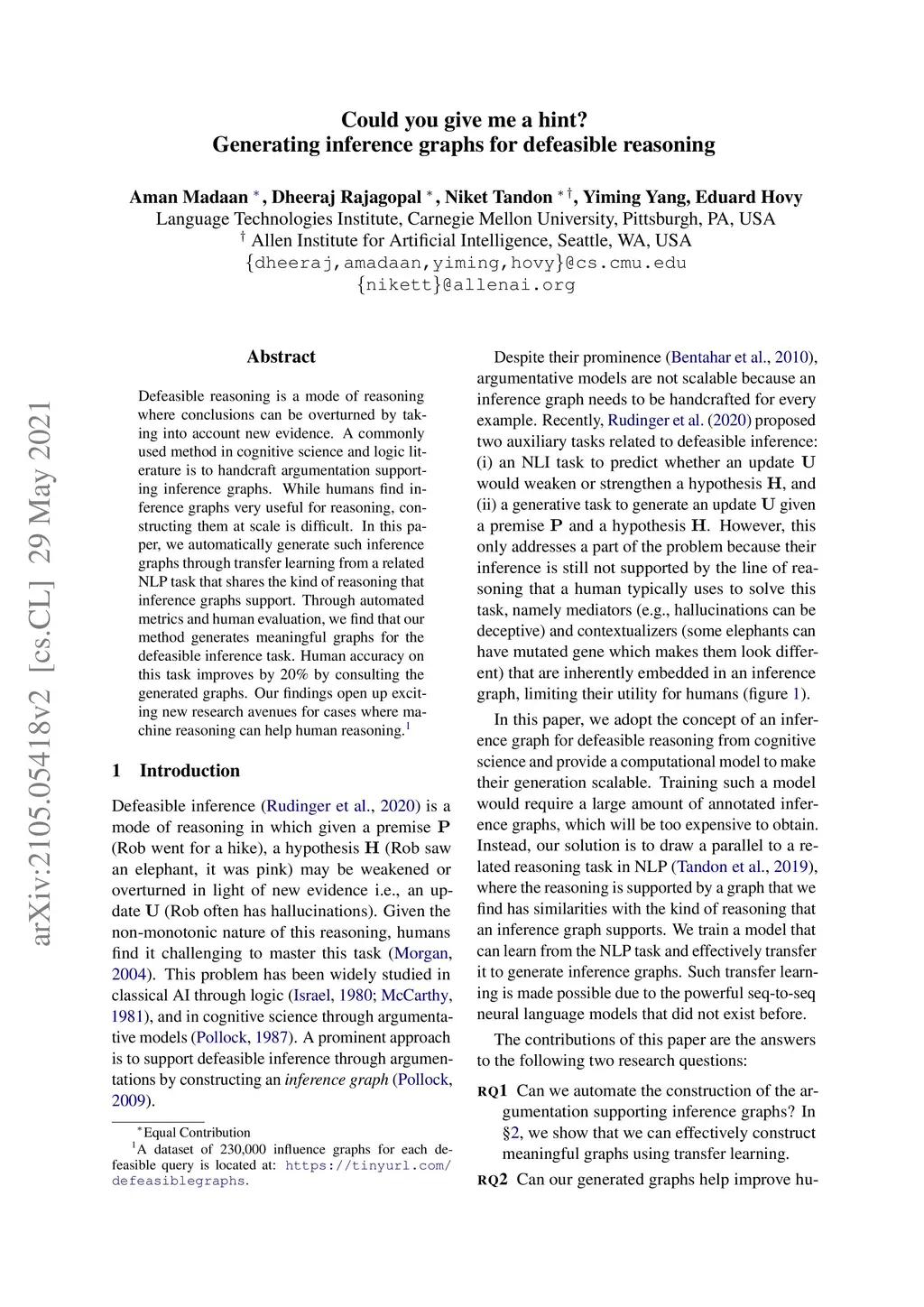 Defeasible reasoning is the mode of reasoning where conclusions can be overturned by taking into account new evidence. A commonly used method in cognitive science and logic literature is to handcraft argumentation supporting inference graphs. While humans find inference graphs very useful for reasoning, constructing them at scale is difficult. In this paper, we automatically generate such inference graphs through transfer learning from another NLP task that shares the kind of reasoning that inference graphs support. Through automated metrics and human evaluation, we find that our method generates meaningful graphs for the defeasible inference task. Human accuracy on this task improves by 20% by consulting the generated graphs. Our findings open up exciting new research avenues for cases where machine reasoning can help human reasoning. (A dataset of 230,000 influence graphs for each defeasible query is located at: https://tinyurl.com/defeasiblegraphs.)