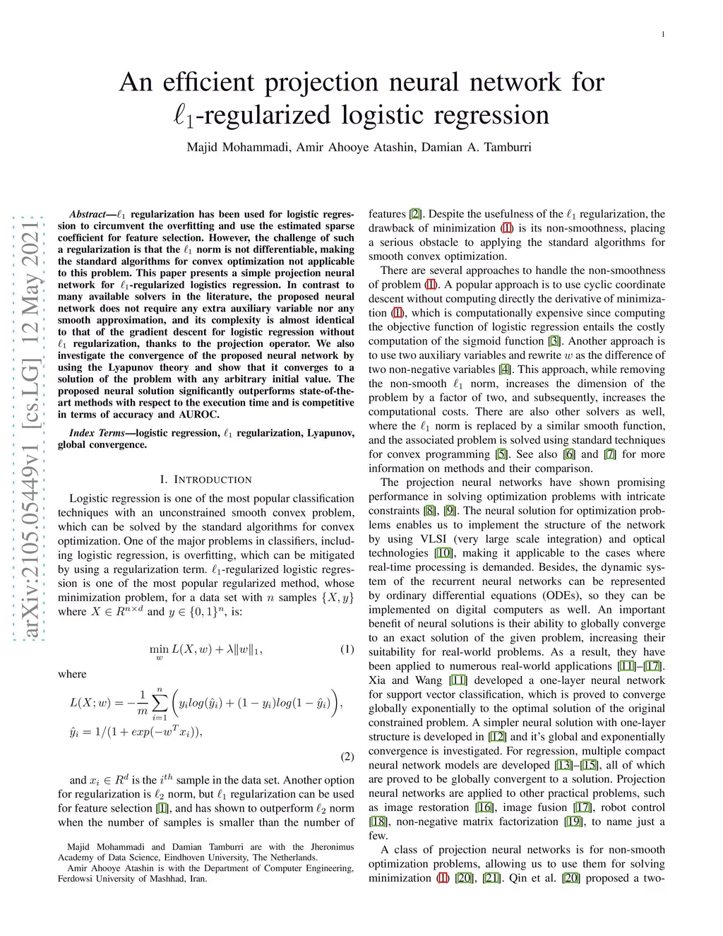 regularization has been used for logistic regression to circumvent the overfitting and use the estimated sparse coefficient for feature selection. However, the challenge of such a regularization is that the norm is not differentiable, making the standard algorithms for convex optimization not applicable to this problem. This paper presents a simple projection neural network for -regularized logistics regression. In contrast to many available solvers in the literature, the proposed neural network does not require any extra auxiliary variable nor any smooth approximation, and its complexity is almost identical to that of the gradient descent for logistic regression without regularization, thanks to the projection operator. We also investigate the convergence of the proposed neural network by using the Lyapunov theory and show that it converges to a solution of the problem with any arbitrary initial value. The proposed neural solution significantly outperforms state-of-the-art methods with respect to the execution time and is competitive in terms of accuracy and AUROC.
