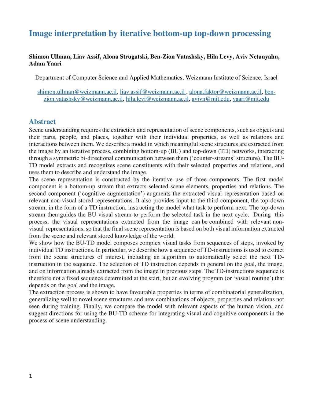 Scene understanding requires the extraction and representation of scene components together with their properties and inter-relations. We describe a model in which meaningful scene structures are extracted from the image by an iterative process, combining bottom-up (BU) and top-down (TD) networks, interacting through a symmetric bi-directional communication between them (counter-streams structure). The model constructs a scene representation by the iterative use of three components. The first model component is a BU stream that extracts selected scene elements, properties and relations. The second component (cognitive augmentation) augments the extracted visual representation based on relevant non-visual stored representations. It also provides input to the third component, the TD stream, in the form of a TD instruction, instructing the model what task to perform next. The TD stream then guides the BU visual stream to perform the selected task in the next cycle. During this process, the visual representations extracted from the image can be combined with relevant non-visual representations, so that the final scene representation is based on both visual information extracted from the scene and relevant stored knowledge of the world. We describe how a sequence of TD-instructions is used to extract from the scene structures of interest, including an algorithm to automatically select the next TD-instruction in the sequence. The extraction process is shown to have favorable properties in terms of combinatorial generalization, generalizing well to novel scene structures and new combinations of objects, properties and relations not seen during training. Finally, we compare the model with relevant aspects of the human vision, and suggest directions for using the BU-TD scheme for integrating visual and cognitive components in the process of scene understanding.