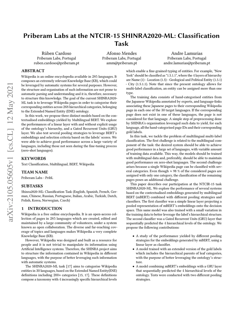 Wikipedia is an online encyclopedia available in 285 languages. It composes an extremely relevant Knowledge Base (KB), which could be leveraged by automatic systems for several purposes. However, the structure and organisation of such information are not prone to automatic parsing and understanding and it is, therefore, necessary to structure this knowledge. The goal of the current SHINRA2020-ML task is to leverage Wikipedia pages in order to categorise their corresponding entities across 268 hierarchical categories, belonging to the Extended Named Entity (ENE) ontology. In this work, we propose three distinct models based on the contextualised embeddings yielded by Multilingual BERT. We explore the performances of a linear layer with and without explicit usage of the ontology's hierarchy, and a Gated Recurrent Units (GRU) layer. We also test several pooling strategies to leverage BERT's embeddings and selection criteria based on the labels' scores. We were able to achieve good performance across a large variety of languages, including those not seen during the fine-tuning process (zero-shot languages).