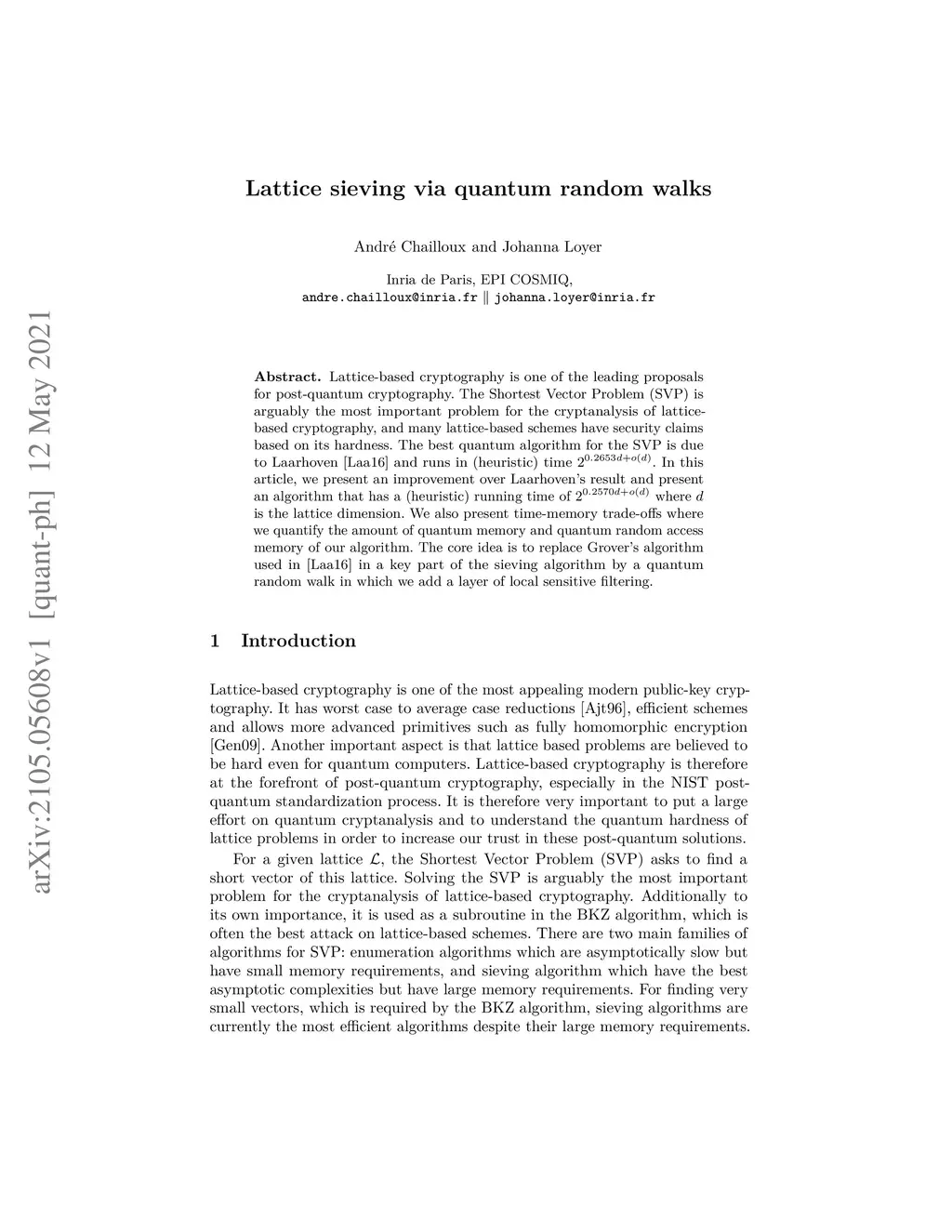 Lattice-based cryptography is one of the leading proposals for post-quantum cryptography. The Shortest Vector Problem (SVP) is arguably the most important problem for the cryptanalysis of lattice-based cryptography, and many lattice-based schemes have security claims based on its hardness. The best quantum algorithm for the SVP is due to Laarhoven [Laa16 PhD] and runs in (heuristic) time . In this article, we present an improvement over Laarhoven's result and present an algorithm that has a (heuristic) running time of where is the lattice dimension. We also present time-memory trade-offs where we quantify the amount of quantum memory and quantum random access memory of our algorithm. The core idea is to replace Grover's algorithm used in [Laa16 PhD] in a key part of the sieving algorithm by a quantum random walk in which we add a layer of local sensitive filtering.