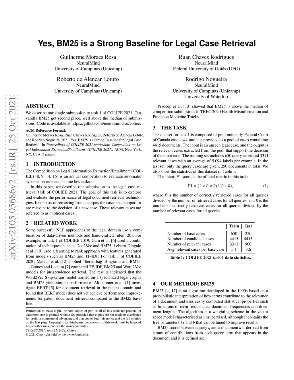 We describe our single submission to task 1 of COLIEE 2021. Our vanilla BM25 got second place, well above the median of submissions. Code is available at https://github.com/neuralmind-ai/coliee.