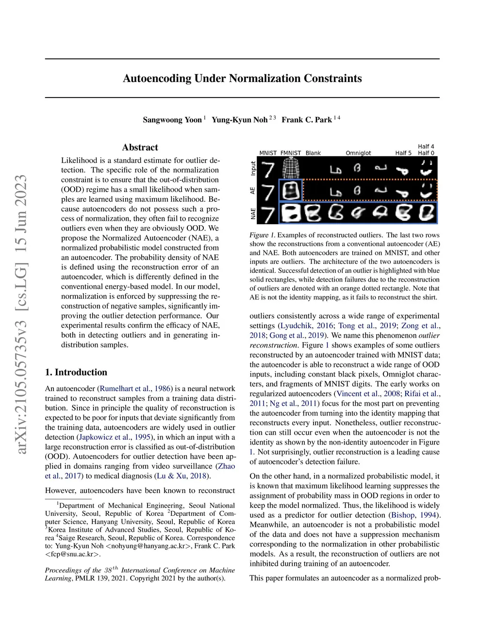 Likelihood is a standard estimate for outlier detection. The specific role of the normalization constraint is to ensure that the out-of-distribution (OOD) regime has a small likelihood when samples are learned using maximum likelihood. Because autoencoders do not possess such a process of normalization, they often fail to recognize outliers even when they are obviously OOD. We propose the Normalized Autoencoder (NAE), a normalized probabilistic model constructed from an autoencoder. The probability density of NAE is defined using the reconstruction error of an autoencoder, which is differently defined in the conventional energy-based model. In our model, normalization is enforced by suppressing the reconstruction of negative samples, significantly improving the outlier detection performance. Our experimental results confirm the efficacy of NAE, both in detecting outliers and in generating in-distribution samples.
