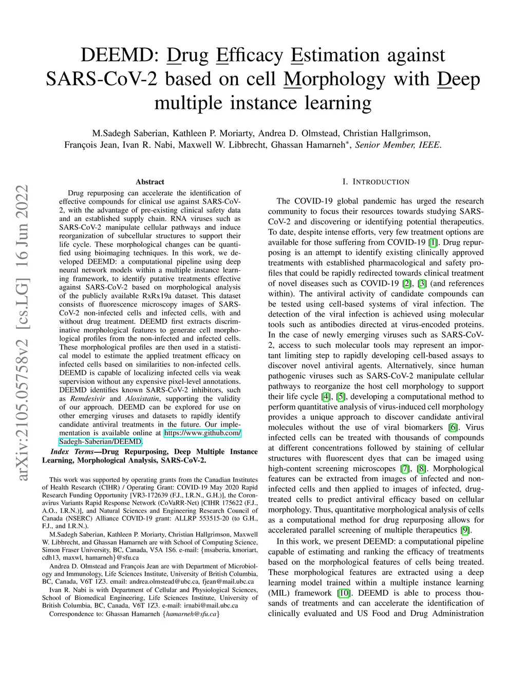 Drug repurposing can accelerate the identification of effective compounds for clinical use against SARS-CoV-2, with the advantage of pre-existing clinical safety data and an established supply chain. RNA viruses such as SARS-CoV-2 manipulate cellular pathways and induce reorganization of subcellular structures to support their life cycle. These morphological changes can be quantified using bioimaging techniques. In this work, we developed DEEMD: a computational pipeline using deep neural network models within a multiple instance learning framework, to identify putative treatments effective against SARS-CoV-2 based on morphological analysis of the publicly available RxRx19a dataset. This dataset consists of fluorescence microscopy images of SARS-CoV-2 non-infected cells and infected cells, with and without drug treatment. DEEMD first extracts discriminative morphological features to generate cell morphological profiles from the non-infected and infected cells. These morphological profiles are then used in a statistical model to estimate the applied treatment efficacy on infected cells based on similarities to non-infected cells. DEEMD is capable of localizing infected cells via weak supervision without any expensive pixel-level annotations. DEEMD identifies known SARS-CoV-2 inhibitors, such as Remdesivir and Aloxistatin, supporting the validity of our approach. DEEMD can be explored for use on other emerging viruses and datasets to rapidly identify candidate antiviral treatments in the future}. Our implementation is available online at https://www.github.com/Sadegh-Saberian/DEEMD