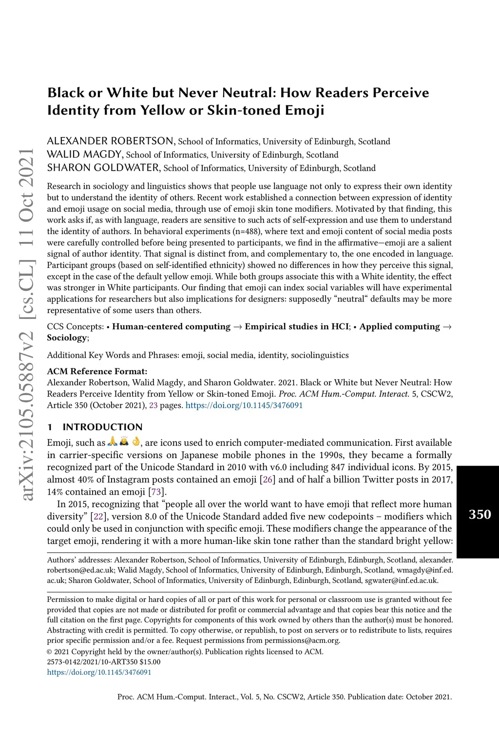 Research in sociology and linguistics shows that people use language not only to express their own identity but to understand the identity of others. Recent work established a connection between expression of identity and emoji usage on social media, through use of emoji skin tone modifiers. Motivated by that finding, this work asks if, as with language, readers are sensitive to such acts of self-expression and use them to understand the identity of authors. In behavioral experiments (n=488), where text and emoji content of social media posts were carefully controlled before being presented to participants, we find in the affirmative -- emoji are a salient signal of author identity. That signal is distinct from, and complementary to, the one encoded in language. Participant groups (based on self-identified ethnicity) showed no differences in how they perceive this signal, except in the case of the default yellow emoji. While both groups associate this with a White identity, the effect was stronger in White participants. Our finding that emoji can index social variables will have experimental applications for researchers but also implications for designers: supposedly ``neutral`` defaults may be more representative of some users than others.
