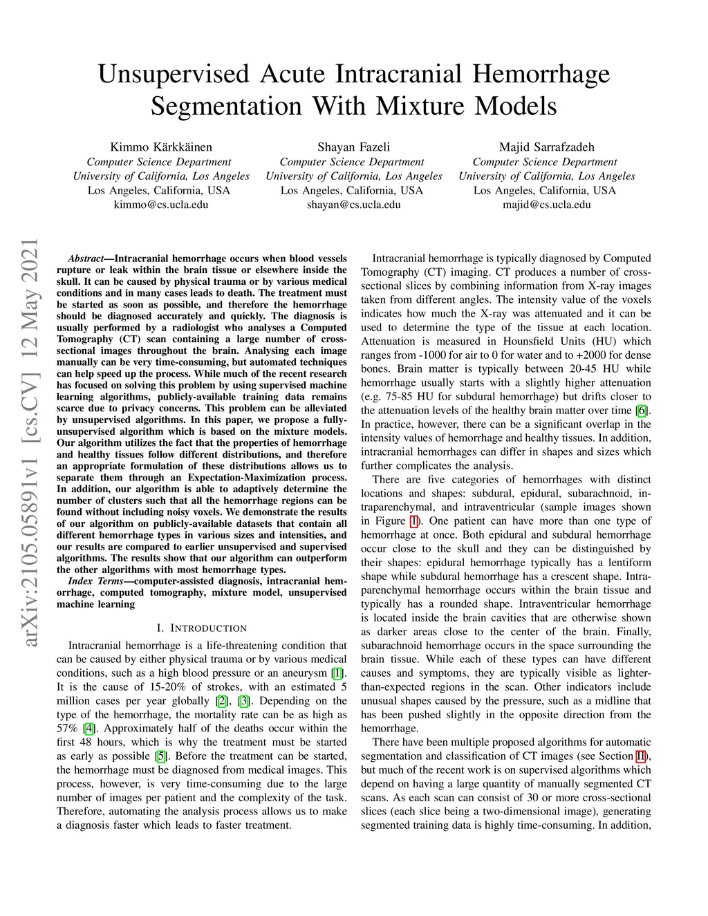 Intracranial hemorrhage occurs when blood vessels rupture or leak within the brain tissue or elsewhere inside the skull. It can be caused by physical trauma or by various medical conditions and in many cases leads to death. The treatment must be started as soon as possible, and therefore the hemorrhage should be diagnosed accurately and quickly. The diagnosis is usually performed by a radiologist who analyses a Computed Tomography (CT) scan containing a large number of cross-sectional images throughout the brain. Analysing each image manually can be very time-consuming, but automated techniques can help speed up the process. While much of the recent research has focused on solving this problem by using supervised machine learning algorithms, publicly-available training data remains scarce due to privacy concerns. This problem can be alleviated by unsupervised algorithms. In this paper, we propose a fully-unsupervised algorithm which is based on the mixture models. Our algorithm utilizes the fact that the properties of hemorrhage and healthy tissues follow different distributions, and therefore an appropriate formulation of these distributions allows us to separate them through an Expectation-Maximization process. In addition, our algorithm is able to adaptively determine the number of clusters such that all the hemorrhage regions can be found without including noisy voxels. We demonstrate the results of our algorithm on publicly-available datasets that contain all different hemorrhage types in various sizes and intensities, and our results are compared to earlier unsupervised and supervised algorithms. The results show that our algorithm can outperform the other algorithms with most hemorrhage types.