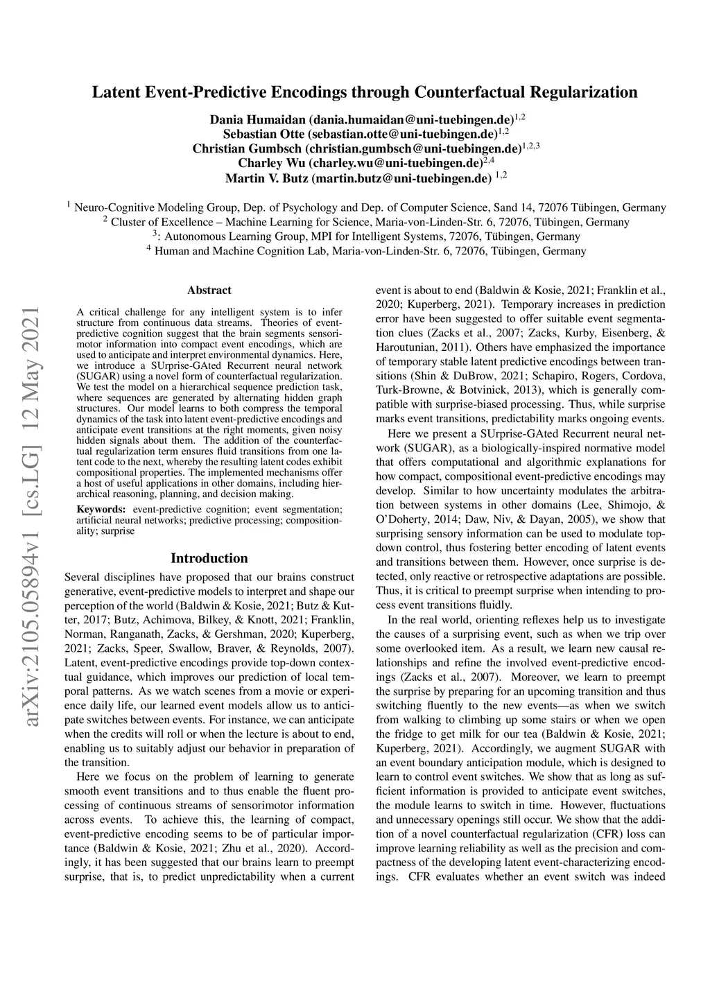 A critical challenge for any intelligent system is to infer structure from continuous data streams. Theories of event-predictive cognition suggest that the brain segments sensorimotor information into compact event encodings, which are used to anticipate and interpret environmental dynamics. Here, we introduce a SUrprise-GAted Recurrent neural network (SUGAR) using a novel form of counterfactual regularization. We test the model on a hierarchical sequence prediction task, where sequences are generated by alternating hidden graph structures. Our model learns to both compress the temporal dynamics of the task into latent event-predictive encodings and anticipate event transitions at the right moments, given noisy hidden signals about them. The addition of the counterfactual regularization term ensures fluid transitions from one latent code to the next, whereby the resulting latent codes exhibit compositional properties. The implemented mechanisms offer a host of useful applications in other domains, including hierarchical reasoning, planning, and decision making.