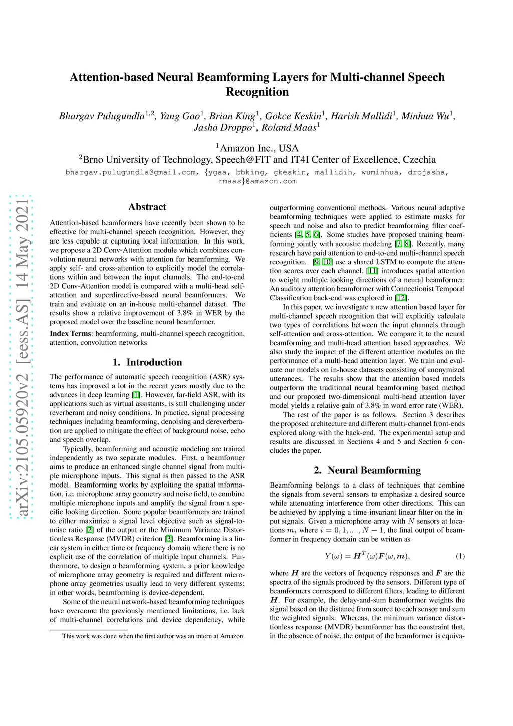 Attention-based Neural Beamforming Layers for Multi-channel Speech