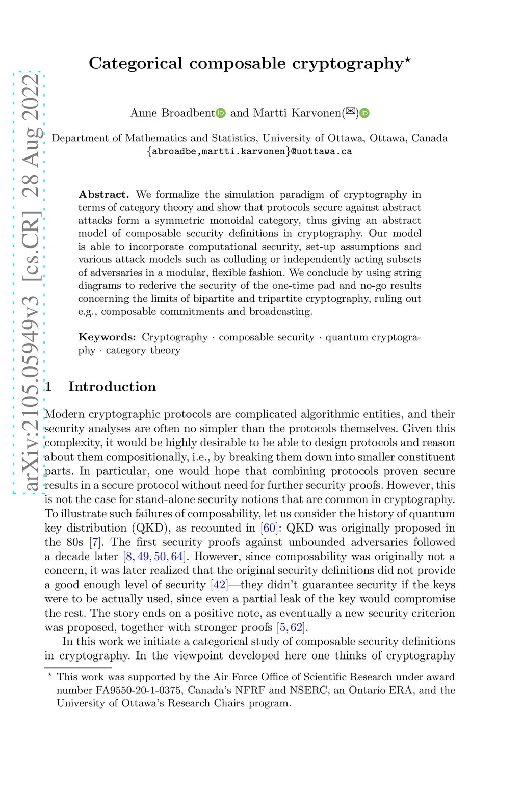 We formalize the simulation paradigm of cryptography in terms of category theory and show that protocols secure against abstract attacks form a symmetric monoidal category, thus giving an abstract model of composable security definitions in cryptography. Our model is able to incorporate computational security, set-up assumptions and various attack models such as colluding or independently acting subsets of adversaries in a modular, flexible fashion. We conclude by using string diagrams to rederive the security of the one-time pad and no-go results concerning the limits of bipartite and tripartite cryptography, ruling out e.g., composable commitments and broadcasting.
