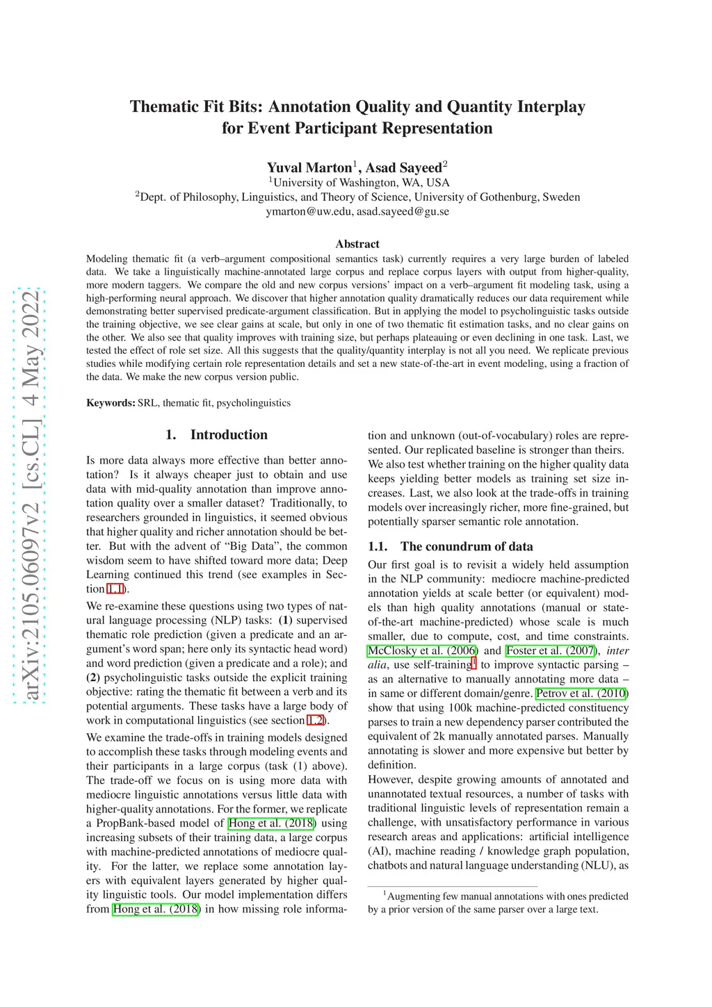 Modeling thematic fit (a verb--argument compositional semantics task) currently requires a very large burden of labeled data. We take a linguistically machine-annotated large corpus and replace corpus layers with output from higher-quality, more modern taggers. We compare the old and new corpus versions' impact on a verb--argument fit modeling task, using a high-performing neural approach. We discover that higher annotation quality dramatically reduces our data requirement while demonstrating better supervised predicate-argument classification. But in applying the model to psycholinguistic tasks outside the training objective, we see clear gains at scale, but only in one of two thematic fit estimation tasks, and no clear gains on the other. We also see that quality improves with training size, but perhaps plateauing or even declining in one task. Last, we tested the effect of role set size. All this suggests that the quality/quantity interplay is not all you need. We replicate previous studies while modifying certain role representation details and set a new state-of-the-art in event modeling, using a fraction of the data. We make the new corpus version public.