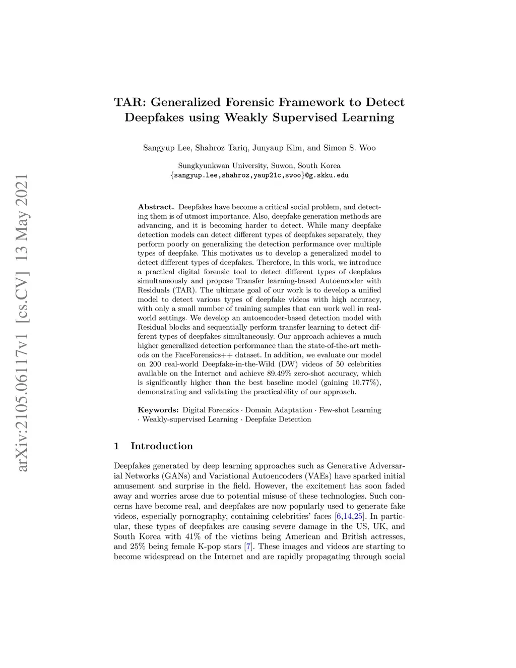 TAR: Generalized Forensic Framework to Detect Deepfakes using Weakly
