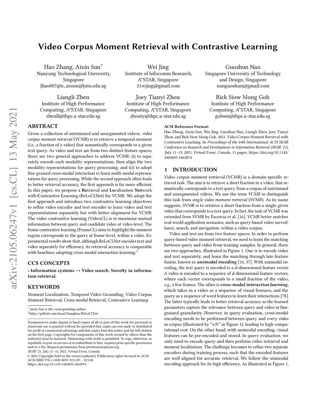 Video Corpus Moment Retrieval with Contrastive Learning