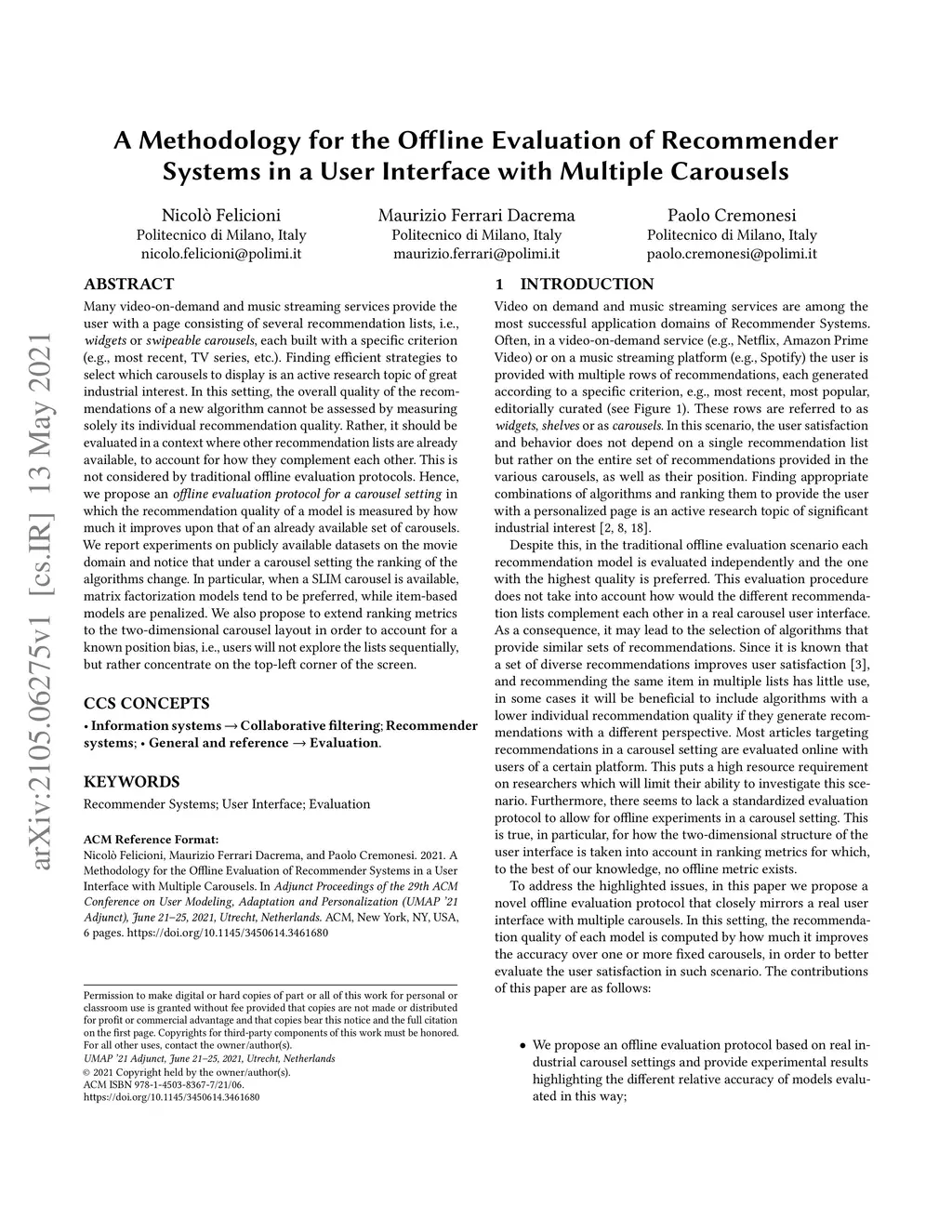 Many video-on-demand and music streaming services provide the user with a page consisting of several recommendation lists, i.e. widgets or swipeable carousels, each built with a specific criterion (e.g. most recent, TV series, etc.). Finding efficient strategies to select which carousels to display is an active research topic of great industrial interest. In this setting, the overall quality of the recommendations of a new algorithm cannot be assessed by measuring solely its individual recommendation quality. Rather, it should be evaluated in a context where other recommendation lists are already available, to account for how they complement each other. This is not considered by traditional offline evaluation protocols. Hence, we propose an offline evaluation protocol for a carousel setting in which the recommendation quality of a model is measured by how much it improves upon that of an already available set of carousels. We report experiments on publicly available datasets on the movie domain and notice that under a carousel setting the ranking of the algorithms change. In particular, when a SLIM carousel is available, matrix factorization models tend to be preferred, while item-based models are penalized. We also propose to extend ranking metrics to the two-dimensional carousel layout in order to account for a known position bias, i.e. users will not explore the lists sequentially, but rather concentrate on the top-left corner of the screen.