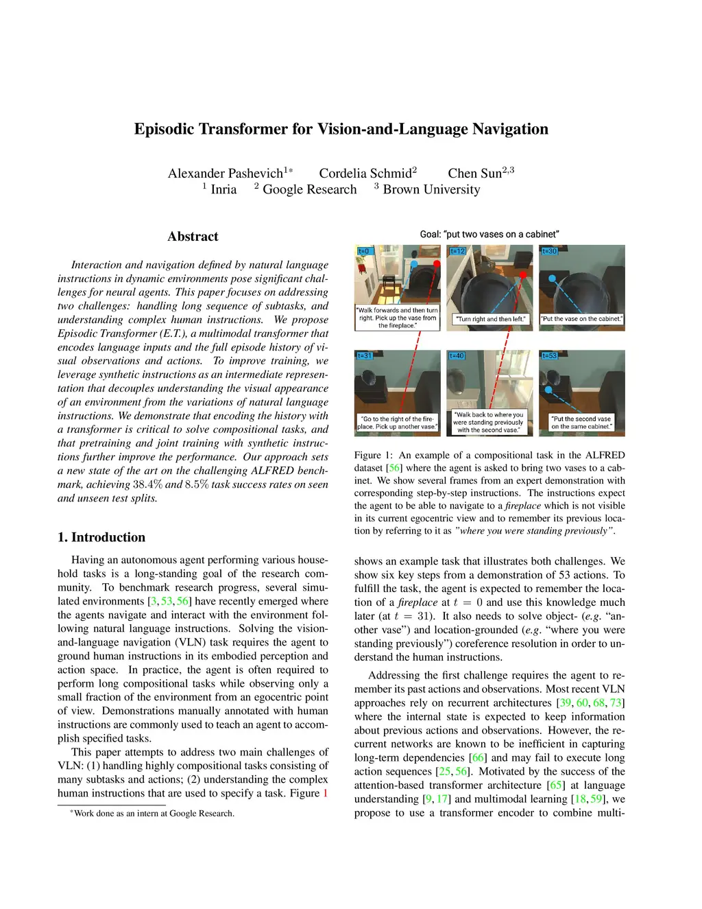 Interaction and navigation defined by natural language instructions in dynamic environments pose significant challenges for neural agents. This paper focuses on addressing two challenges: handling long sequence of subtasks, and understanding complex human instructions. We propose Episodic Transformer (E.T.), a multimodal transformer that encodes language inputs and the full episode history of visual observations and actions. To improve training, we leverage synthetic instructions as an intermediate representation that decouples understanding the visual appearance of an environment from the variations of natural language instructions. We demonstrate that encoding the history with a transformer is critical to solve compositional tasks, and that pretraining and joint training with synthetic instructions further improve the performance. Our approach sets a new state of the art on the challenging ALFRED benchmark, achieving 38.4% and 8.5% task success rates on seen and unseen test splits.