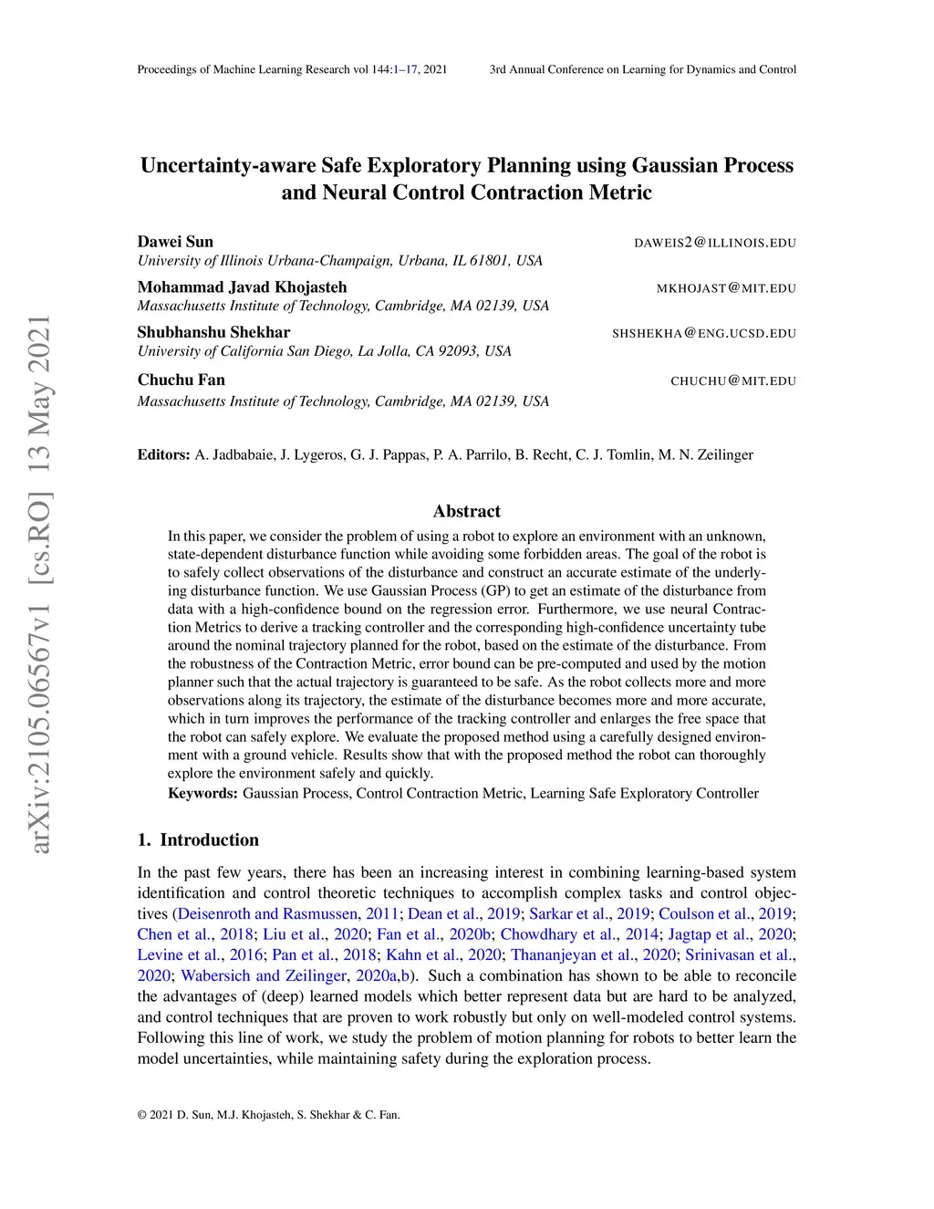 In this paper, we consider the problem of using a robot to explore an environment with an unknown, state-dependent disturbance function while avoiding some forbidden areas. The goal of the robot is to safely collect observations of the disturbance and construct an accurate estimate of the underlying disturbance function. We use Gaussian Process (GP) to get an estimate of the disturbance from data with a high-confidence bound on the regression error. Furthermore, we use neural Contraction Metrics to derive a tracking controller and the corresponding high-confidence uncertainty tube around the nominal trajectory planned for the robot, based on the estimate of the disturbance. From the robustness of the Contraction Metric, error bound can be pre-computed and used by the motion planner such that the actual trajectory is guaranteed to be safe. As the robot collects more and more observations along its trajectory, the estimate of the disturbance becomes more and more accurate, which in turn improves the performance of the tracking controller and enlarges the free space that the robot can safely explore. We evaluate the proposed method using a carefully designed environment with a ground vehicle. Results show that with the proposed method the robot can thoroughly explore the environment safely and quickly.