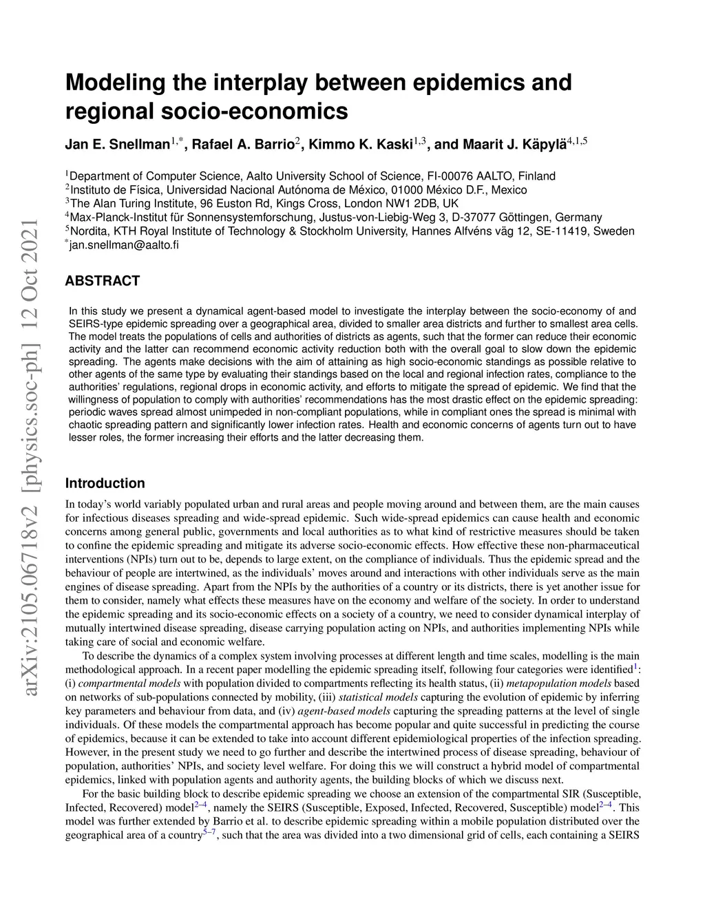 In this study we present a dynamical agent-based model to investigate the interplay between the socio-economy of and SEIRS-type epidemic spreading over a geographical area, divided to smaller area districts and further to smallest area cells. The model treats the populations of cells and authorities of districts as agents, such that the former can reduce their economic activity and the latter can recommend economic activity reduction both with the overall goal to slow down the epidemic spreading. The agents make decisions with the aim of attaining as high socio-economic standings as possible relative to other agents of the same type by evaluating their standings based on the local and regional infection rates, compliance to the authorities' regulations, regional drops in economic activity, and efforts to mitigate the spread of epidemic. We find that the willingness of population to comply with authorities' recommendations has the most drastic effect on the epidemic spreading: periodic waves spread almost unimpeded in non-compliant populations, while in compliant ones the spread is minimal with chaotic spreading pattern and significantly lower infection rates. Health and economic concerns of agents turn out to have lesser roles, the former increasing their efforts and the latter decreasing them.
